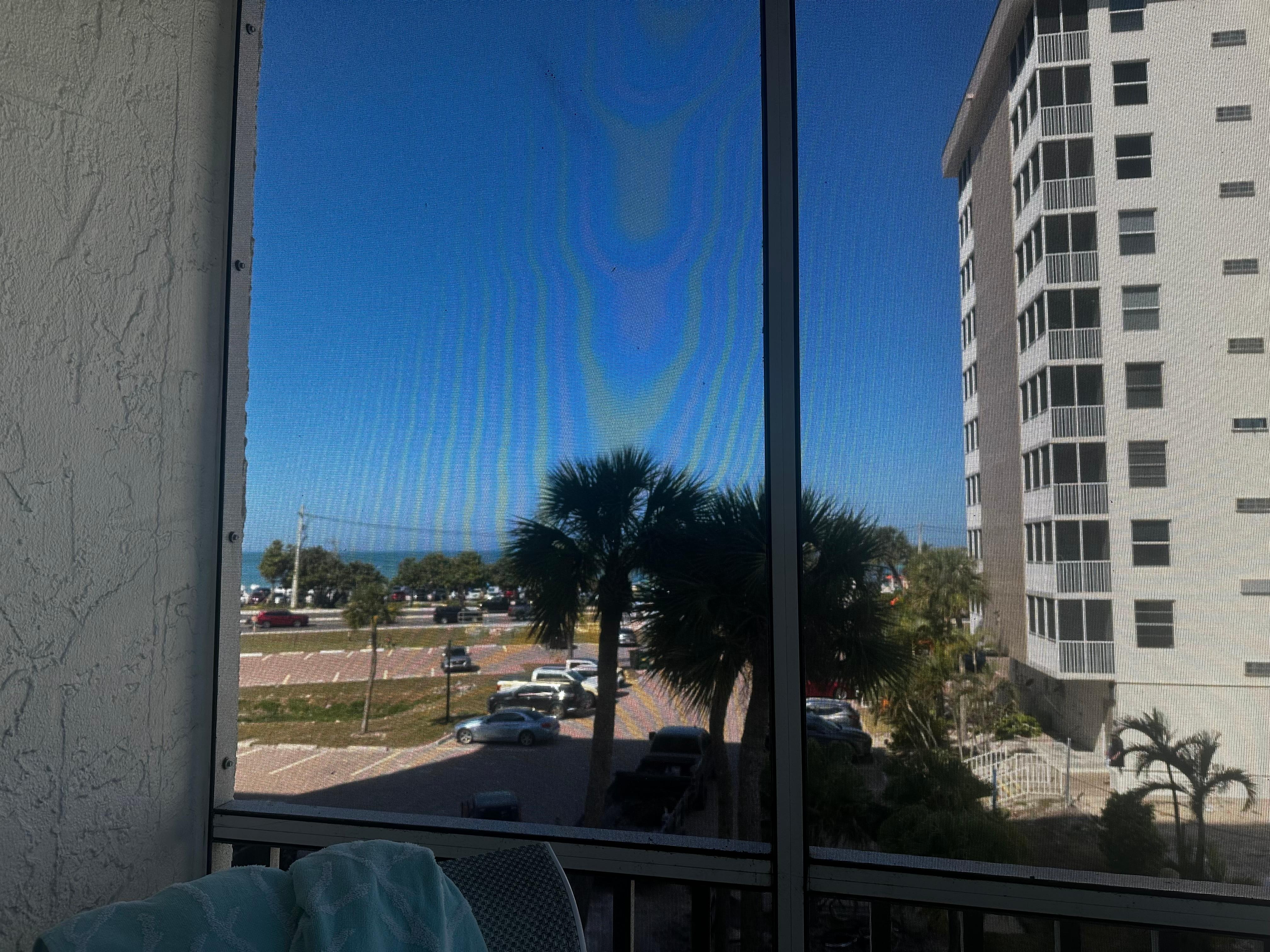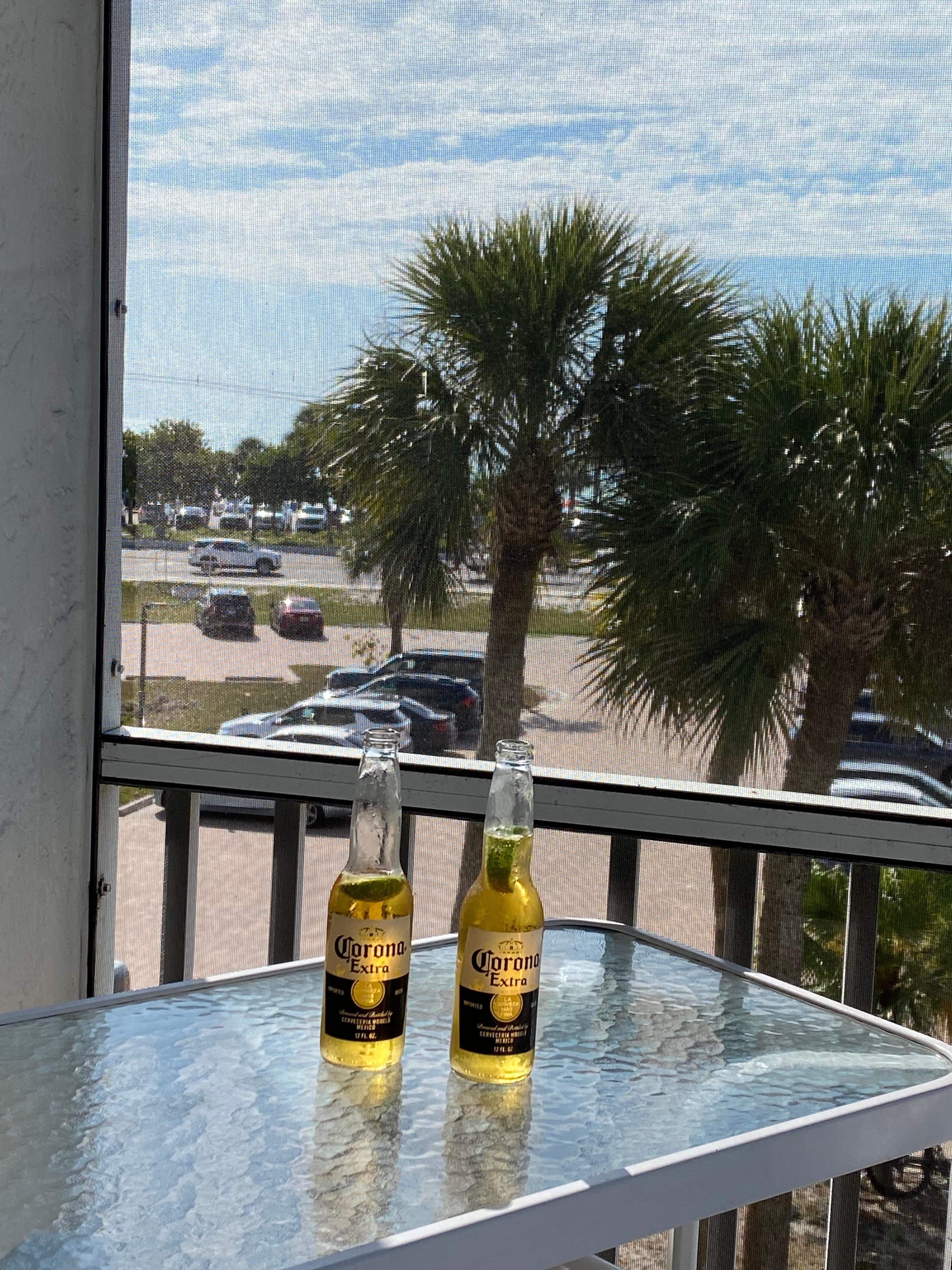 Serene private lanai surrounded by palm trees, pool views, and glimpses of the Gulf—especially enchanting in the evening when the pool lights shimmer like an aquamarine gemstone.