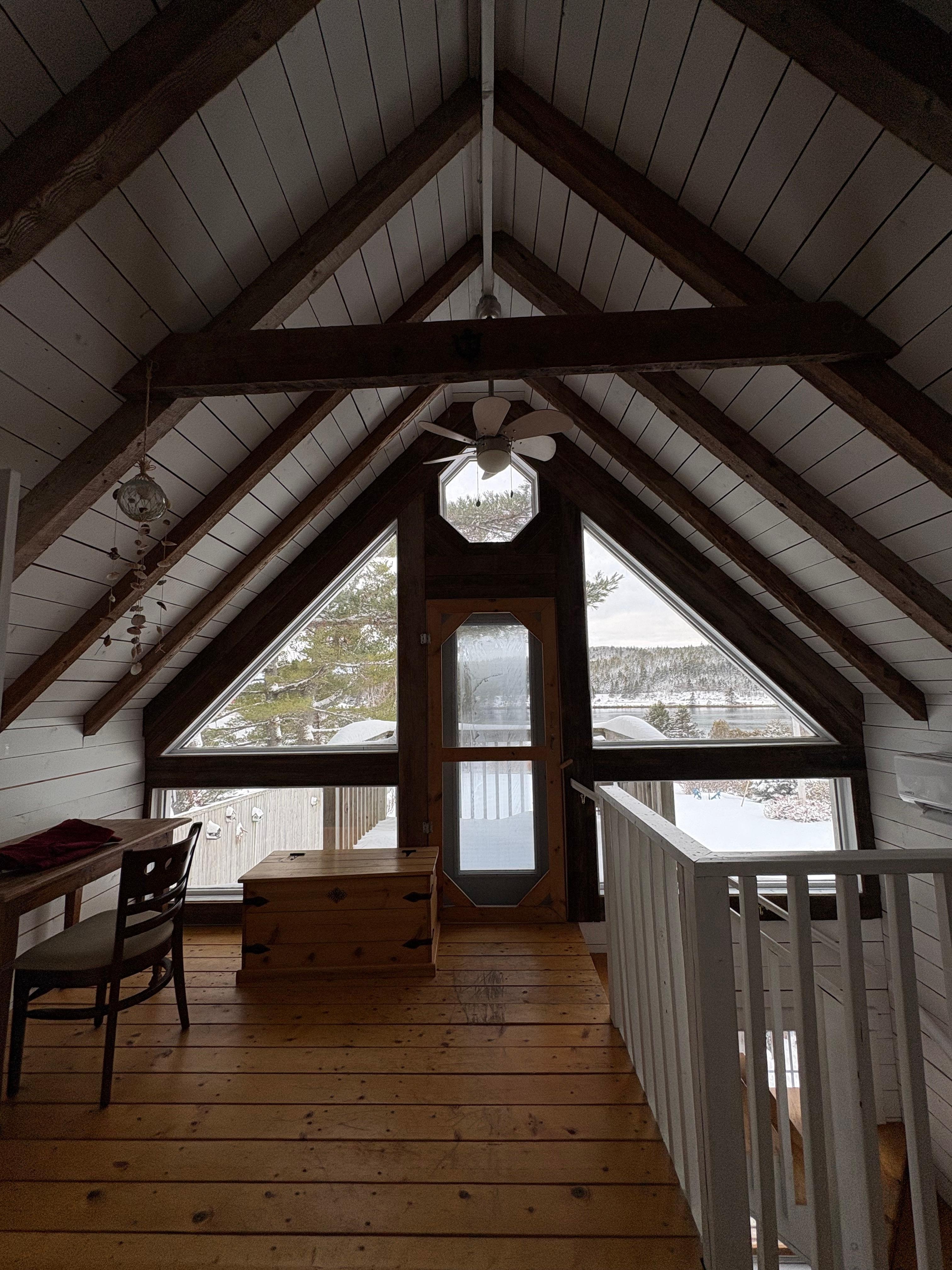 Inside, the cottage features vaulted ceilings, exposed wood beams, and arched entryways, giving the space a warm and rustic coastal character. The open living area is bright and welcoming, with large windows that bring in natural light and ocean views. A wood-burning stove adds warmth and a cozy atmosphere, especially during cooler months.