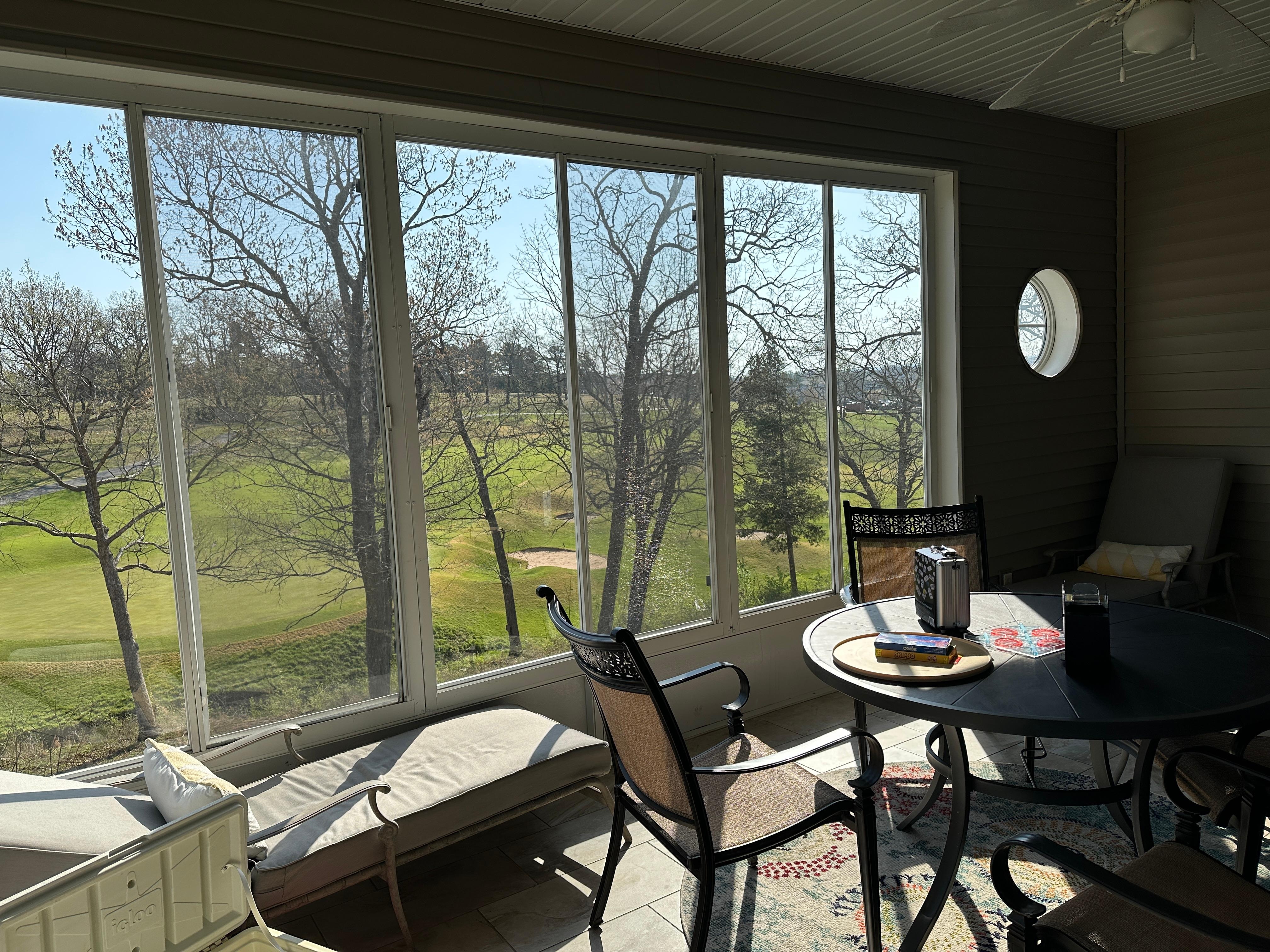 *Large enclosed sunroom with great golf course and hills of Branson.
