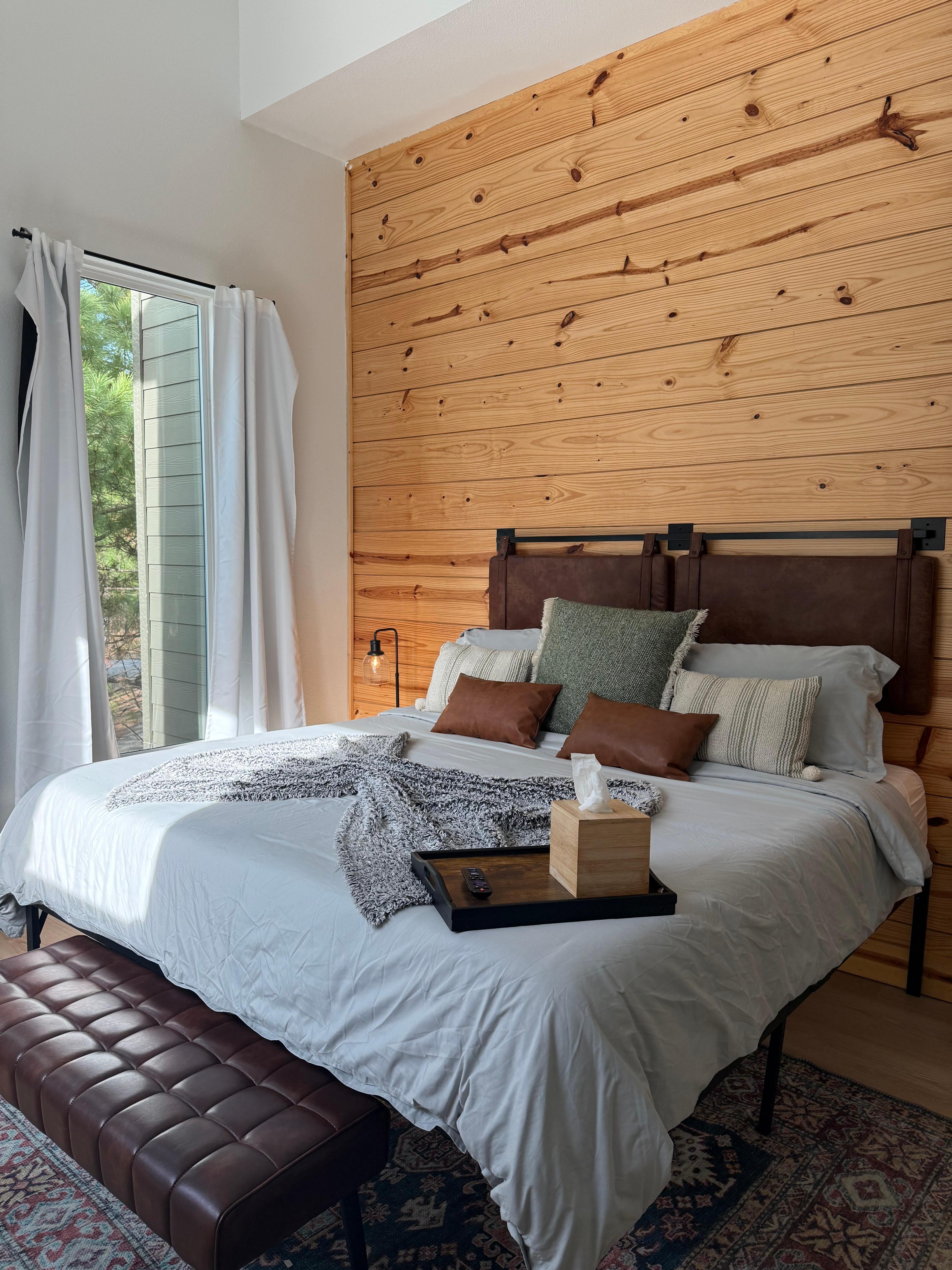 2 master bedrooms (1 up and 1 down) provide guests with luxuriously comfortable king-sized beds, topped with a super comfy mattress. It’s so cozy, you may have trouble getting out of bed in the morning! Not only will you be able to enjoy your favorite TV shows on the large smart TV, but also the breathtaking views through the exceptionally large windows bringing nature indoors. In the mornings, step through the doors to enjoy alone time and a warm cup of coffee on the back patio before everyone else wakes up.