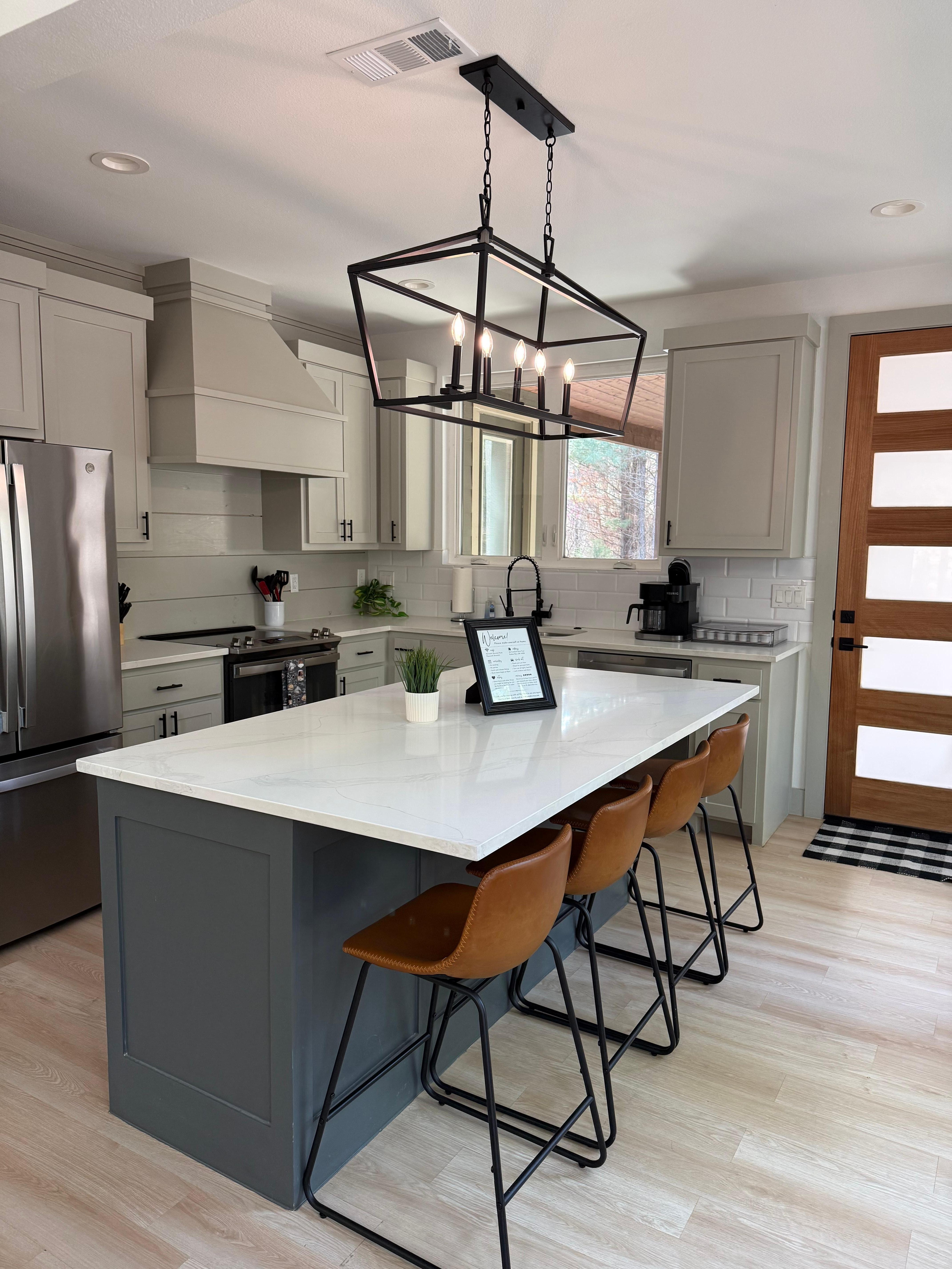 We’ve added lots of personal touches throughout the cabin. Looking to unwind with some home cooking while you’re here? Get some cooking ideas from our favorite recipe books! We threw in a rack of spices to inspire you. We like to keep things casual yet stylish for your visit. The exquisite granite kitchen island is as functional as it is attractive, providing space for the family to gather around to enjoy meals or keep the chef company.