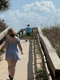 Lots of thoughtful amenities like beach chairs, umbrella, cooler, beach bag, toys and towels, everything needed for a great outing to the beach, which is connected to the condos via private walkway. Unit is nicely appointed, and the onsite pool is excellent with depth ranging to 8.5 feet. Well-kept grounds. Many restaurants and attractions nearby. Quiet place with respectful visitors. Dedicated parking. In-unit washer-dryer. Nice patio with several chairs near the pool. Comfortable beds, strong AC and shower water pressure. Nice dining area/living room. TVs in living room and both bedrooms. No ocean view but the beach is about 100 yards away and near a pier where we booked surf lessons and the kids enjoyed the Chuck E. Cheese arcade. Beach is well-patrolled by police. Lots of families enjoying the sun and sand, but none of the beach noise makes it back to the condos. Really an ideal vacation spot.
