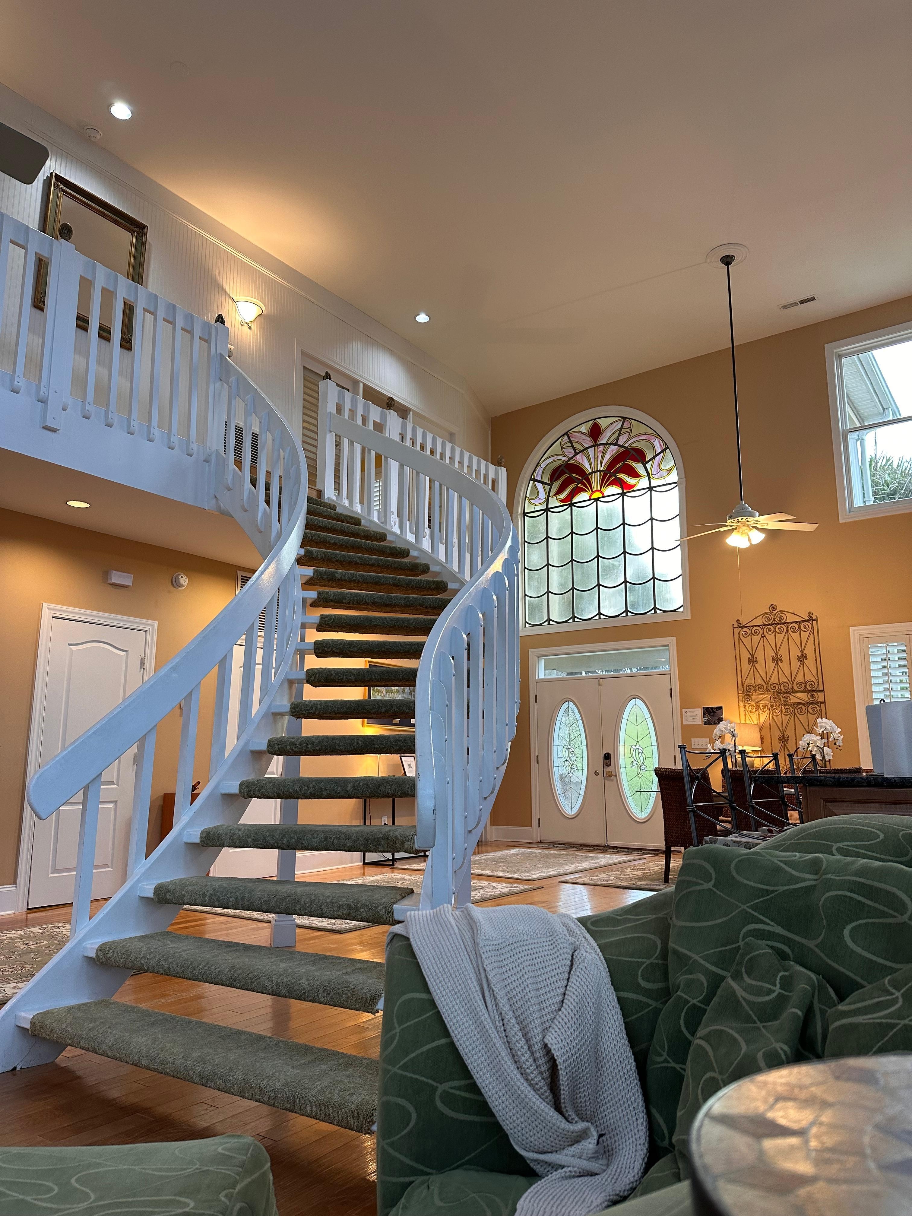Master bedroom suite is on the first floor housing 1 king bed, ensuite bathroom, and doors that open onto the oceanfront porch. Bathroom is fully private with a standing shower. Street side king bedroom suite, also on the 1st floor, sleeps 2 comfortably on 1 king bed, also with an ensuite bathroom. This spacious bathroom includes a tub/shower combo. Make your way up the grand staircase to bedrooms 3 and 4 on 2nd floor. These bedrooms share access to a large jack-n-jill bathroom with a tub, standing shower, and double sinks. Bedroom 3 has 1 king bed and it's own, private oceanfront balcony. Bedroom 4 sleeps 4 guests in 2 queen beds. Freshly laundered bed linens and bath towel sets are provided for the maximum occupancy of the home.