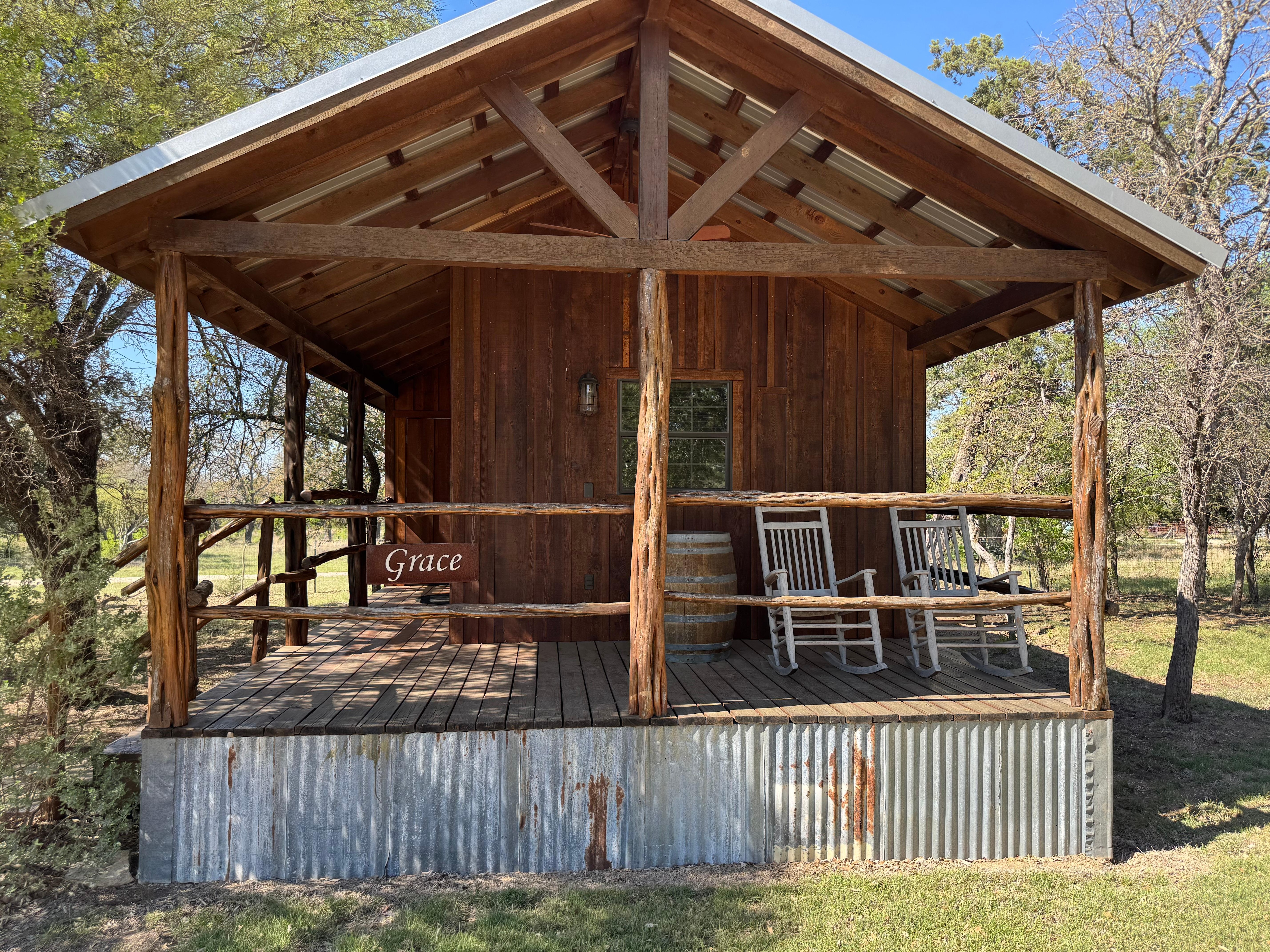 Come, sit, and relax on the porch of one of our newly built cabins. Take in the fresh air and enjoy the countryside views, wildlife, farm animals, and breathtaking sunsets. Our four cabins, Faith, Hope, Mercy, and Grace, each feature their own rustic/elegant style and charm. All the cabins sleep two on a king sized bed with luxurious sheets and bedding, while the bathrooms each feature a large shower and copper sink.