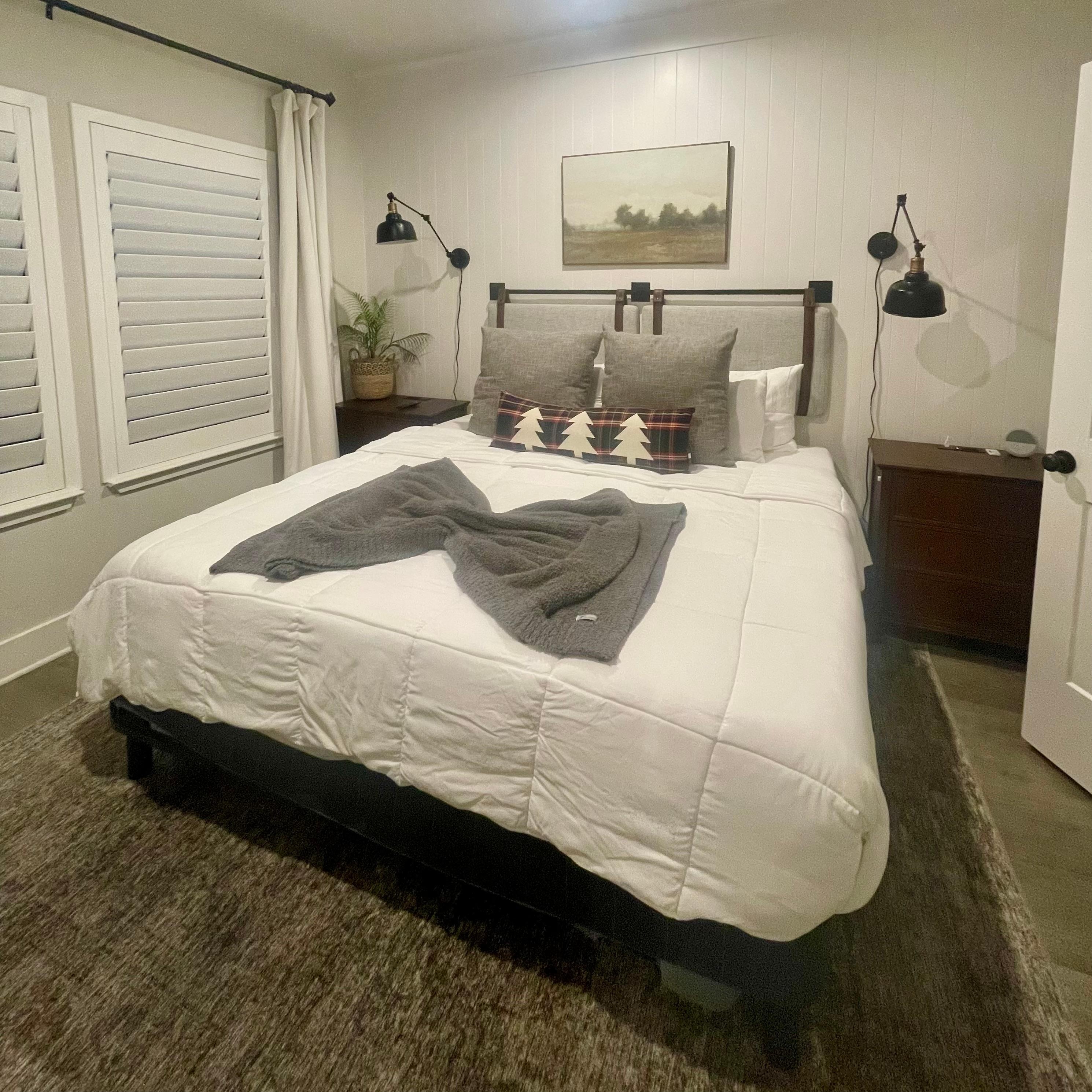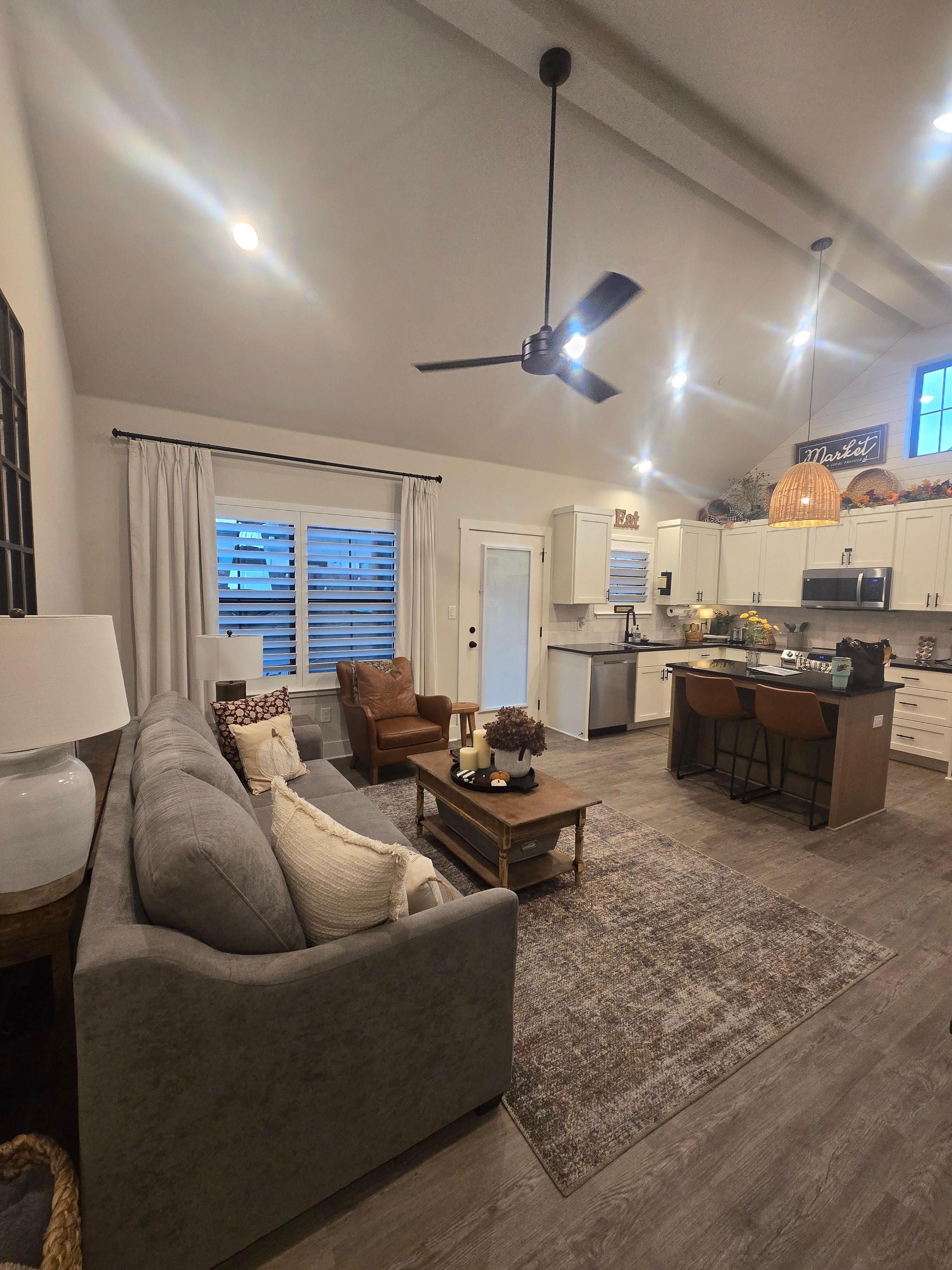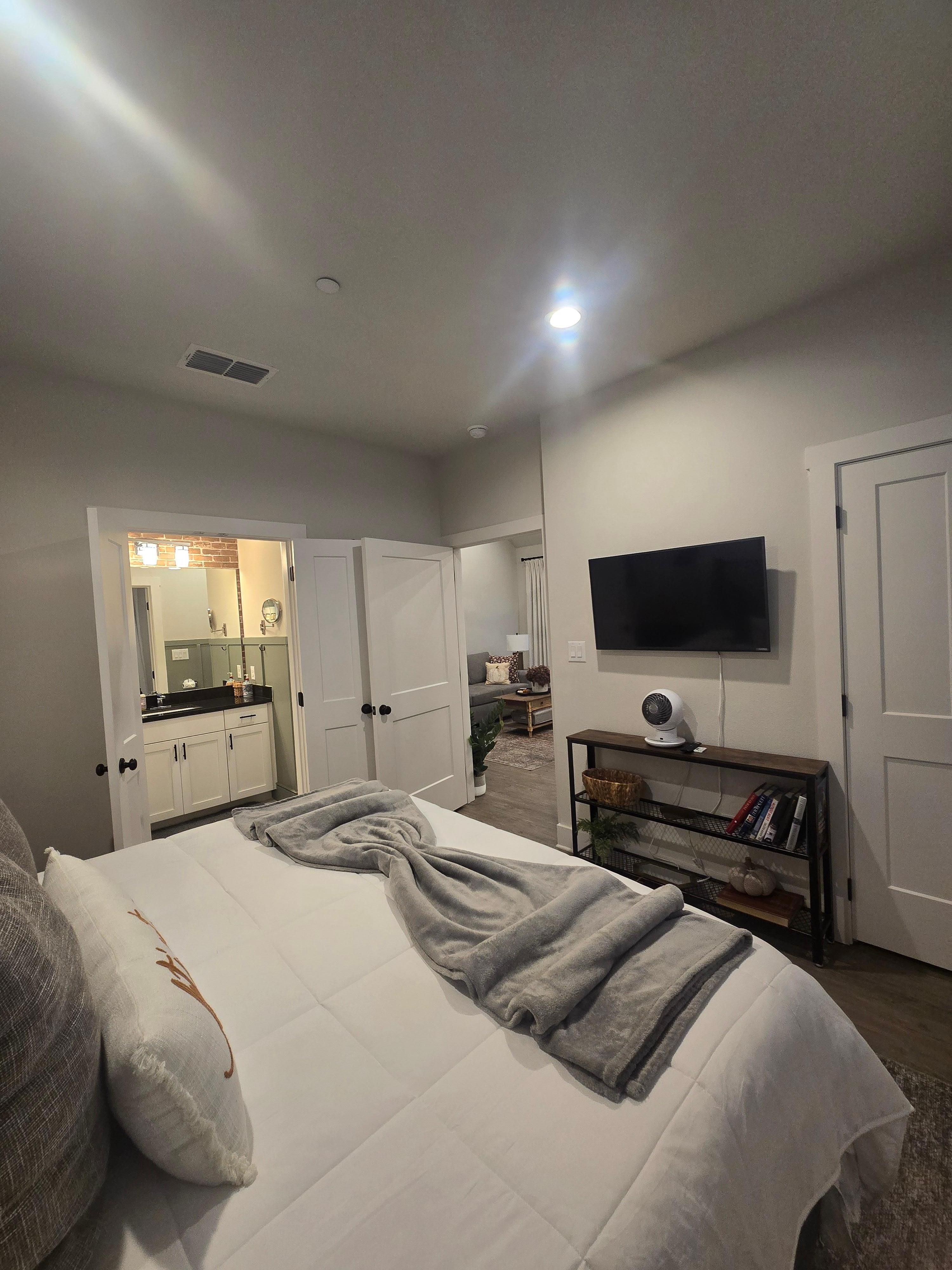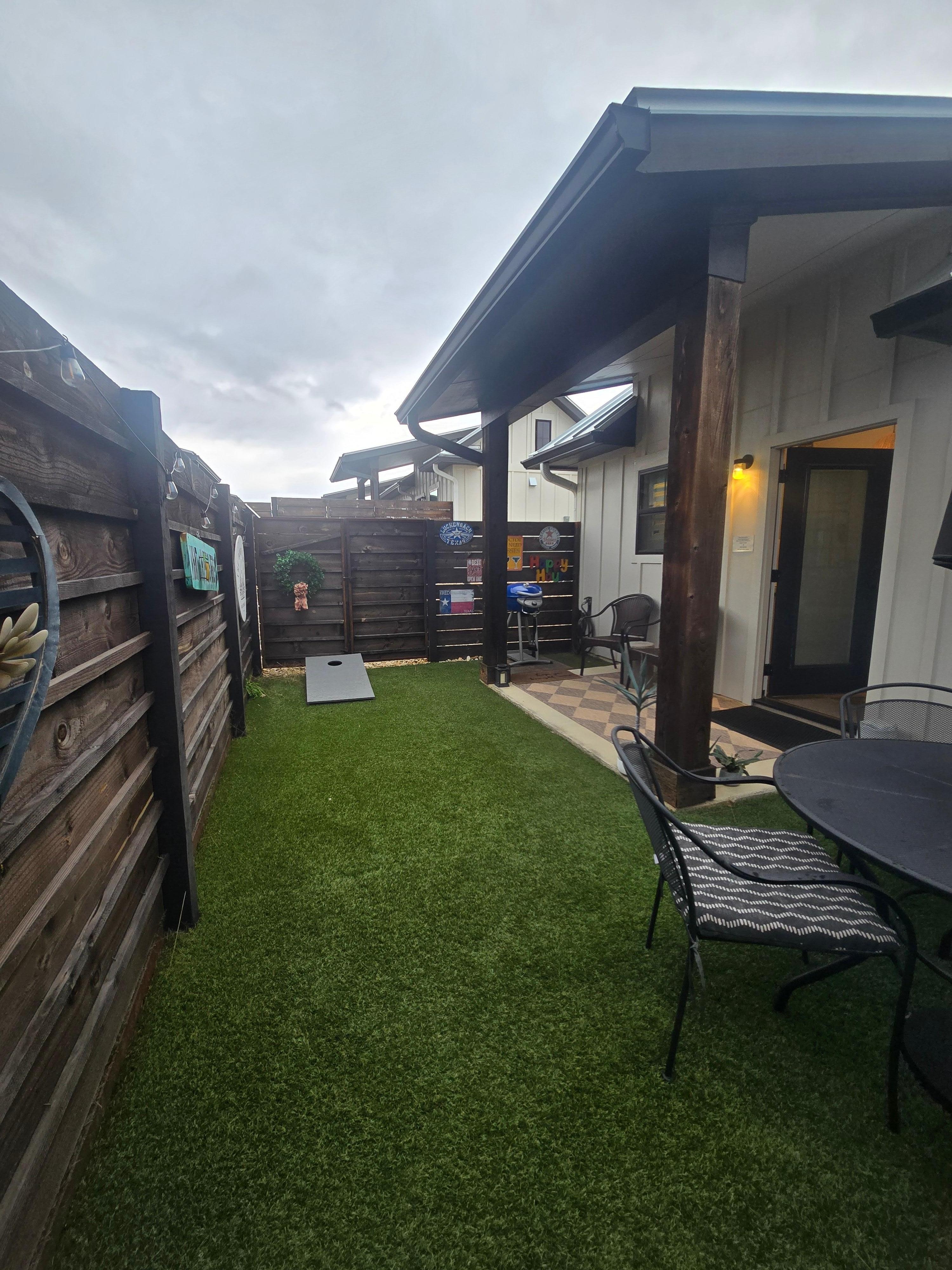 This brand new impeccably decorated condo is conveniently located between Main Street and Wine Road 290. The open concept living and dining area combines comfort and luxury and has everything you need to whip up a gourmet meal or enjoy the Smart TV from the comfy sofa. Just outside on the private patio, wind down after a beautiful day in the Hill Country with a glass of wine while playing a game of cornhole. The private bath offers upscale finishes and a spacious walk-in shower. At night, retreat to the king bedroom featuring a modern upholstered headboard and furnished with crisp white linens. Enjoy all this newly constructed suite has to offer while you “nest” in the 'Burg.
