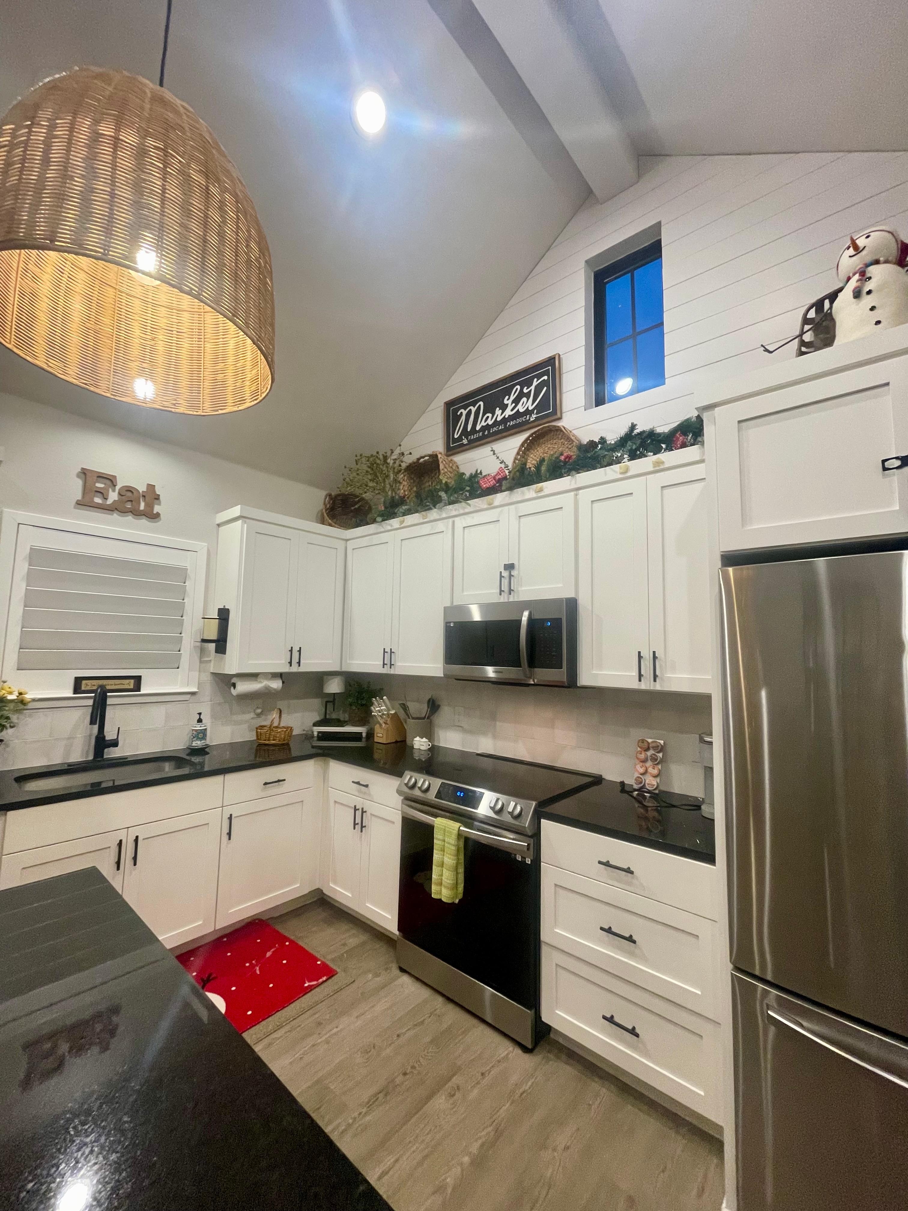 AMENITIES - 55" Smart TV, full Kitchen, large private patio with outdoor seating, games, outdoor string lighting, & electric grill