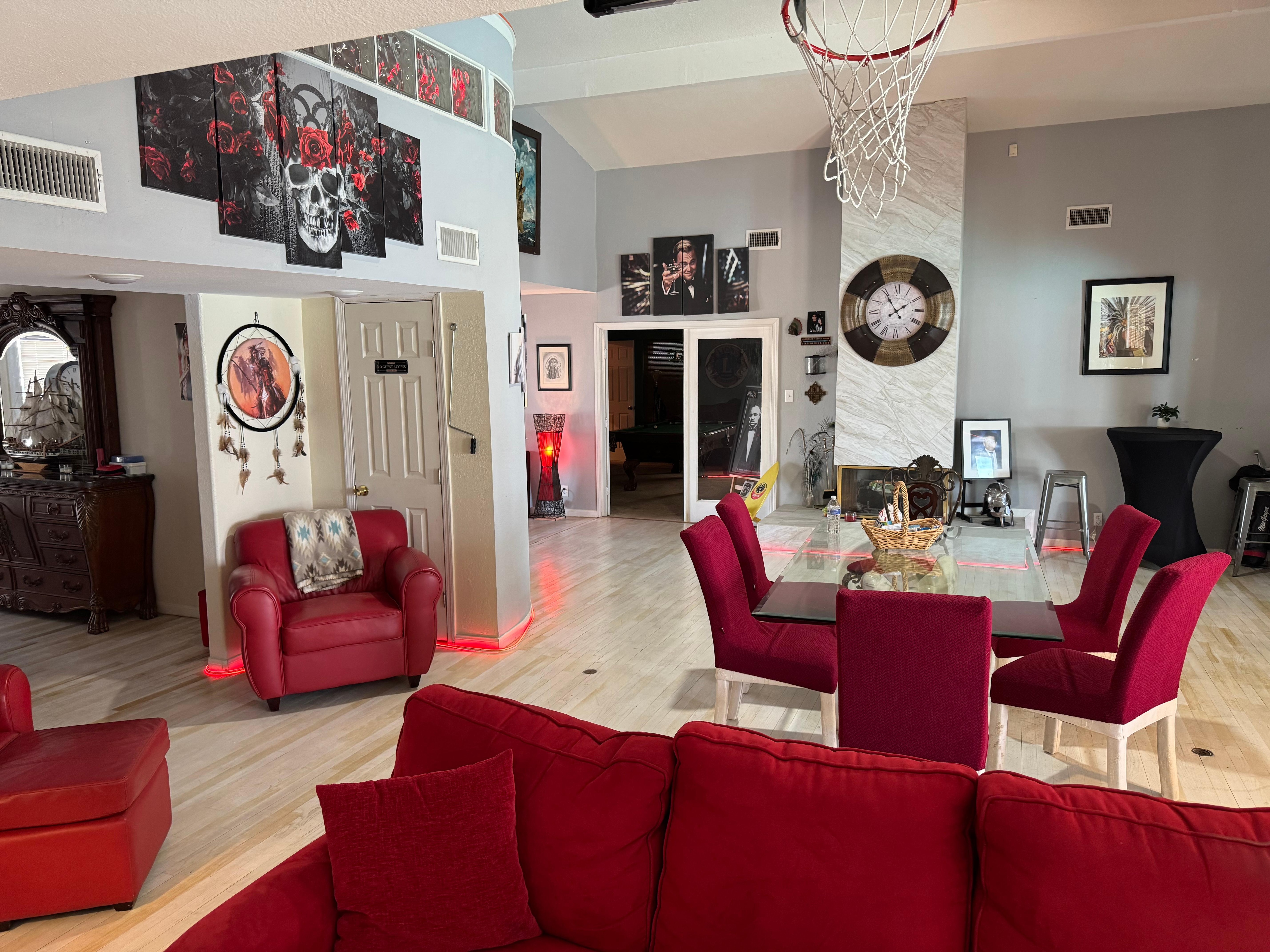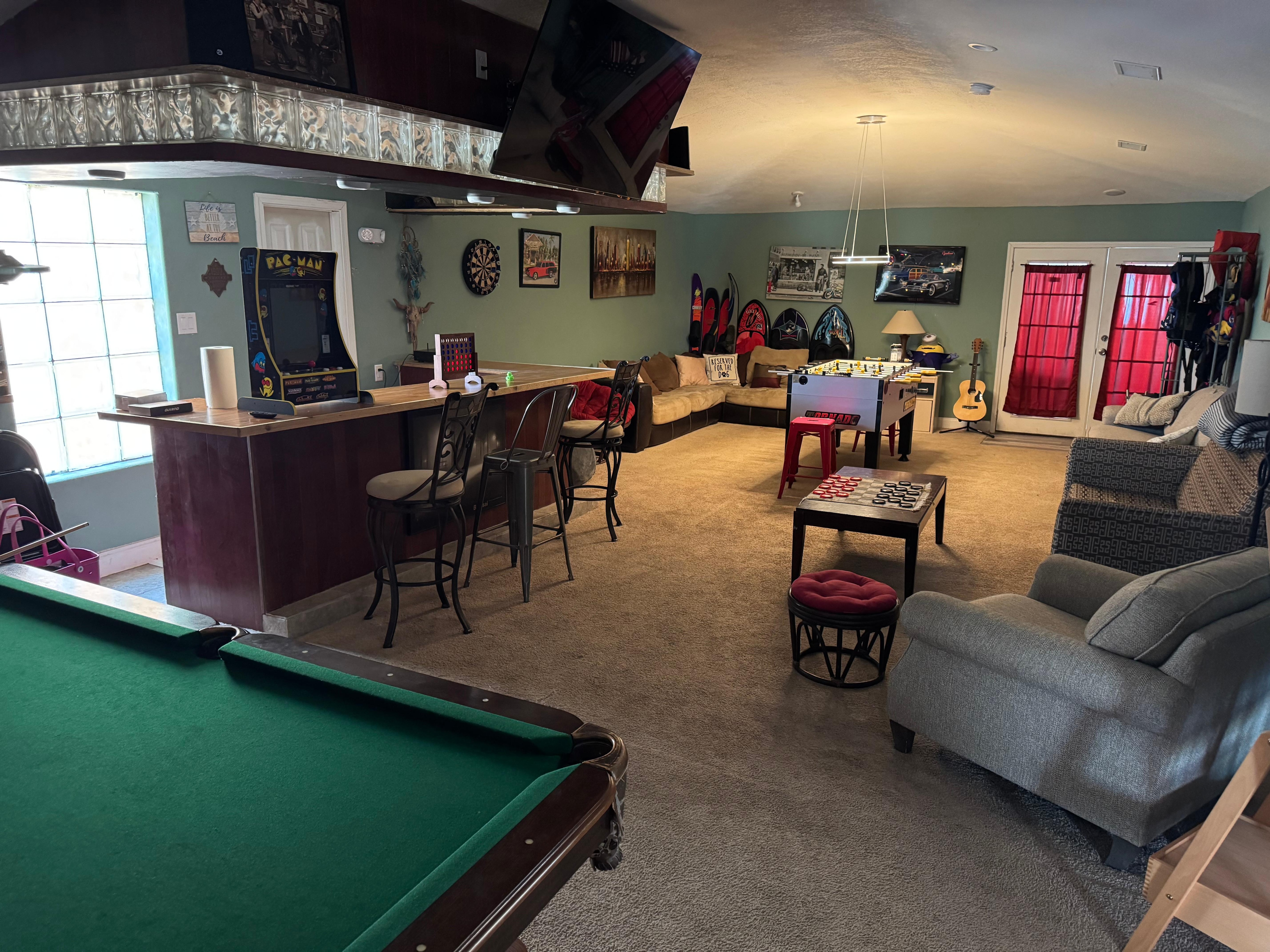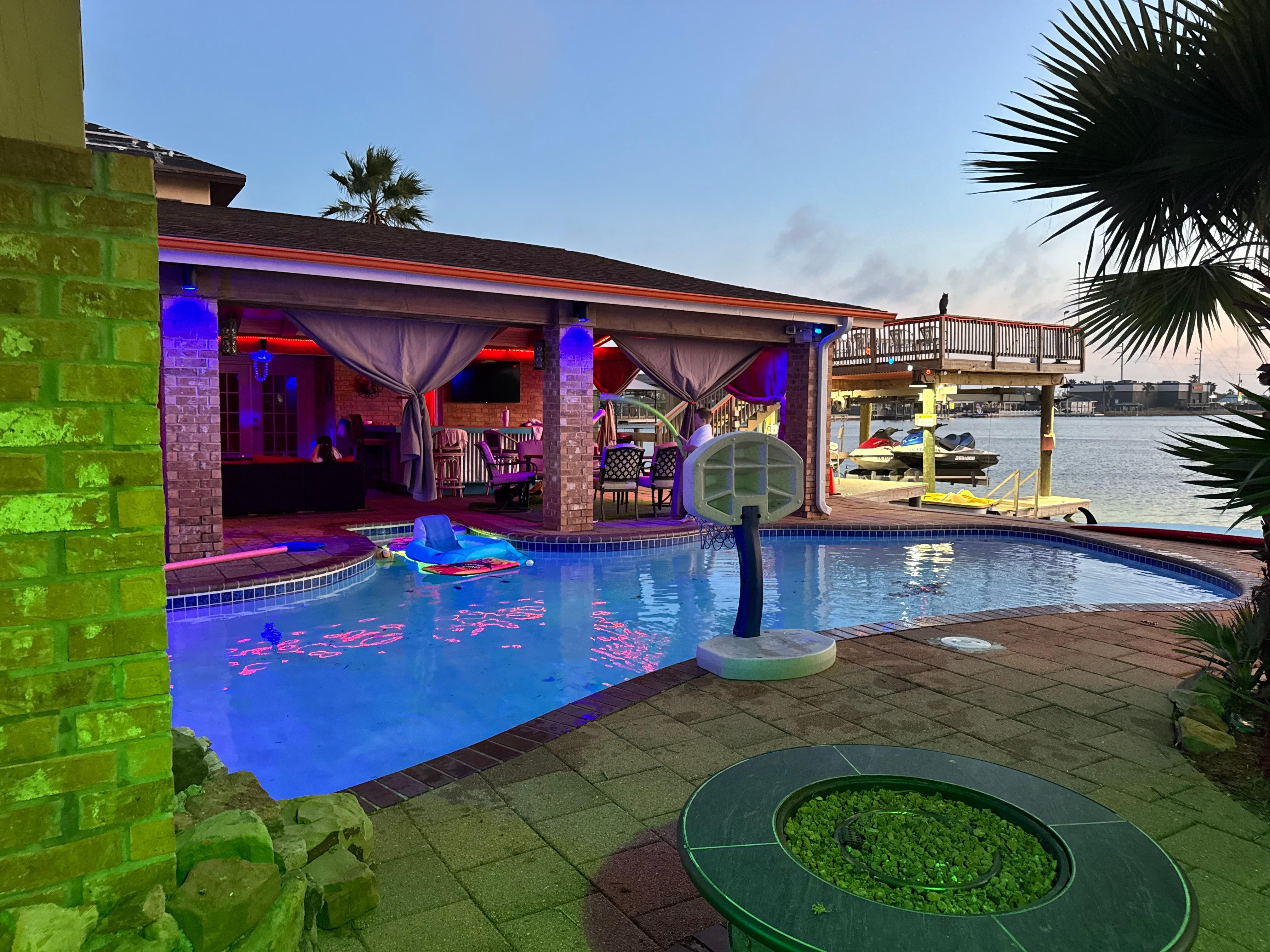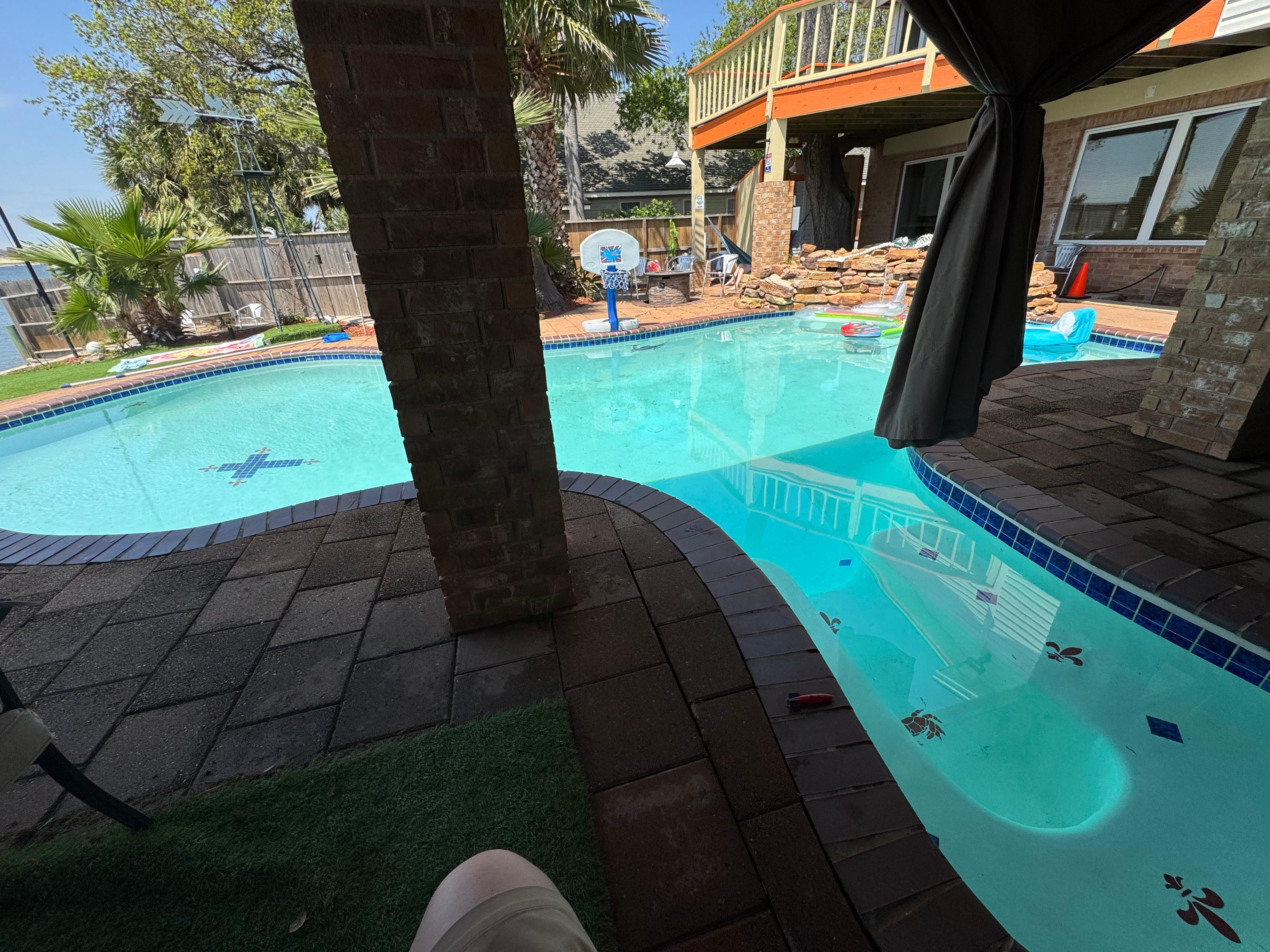 The house was exceptionally nice, very unassuming from outside curb of hill. Once you come in, you can definitely tell it is a modern take on a eclectic sensibility. Much larger on the inside than it looks from the outside. The pool and outside patio area were fantastic, with a wonderful view of the water. However, it is listed as a five bedroom home on Vrbos listing, however, we were unable to find two bedrooms, we were only able to find three. The staircase going up from the main entrance to the upstairs bedrooms, we believe to be very dangerous. The paint used on the stairs are very slippery, and there is no handrail. I recommend putting in a handrail immediately, and putting some sort of grip pieces on the stairs to prevent slipping. Two of our guests, including my husband fell multiple times. The use of the jet skis would have been redemption for anything negative the house offered, even if the host charged more, we would have been happy to pay it. The Jacuzzi tub in the master bathroom did not work at all, we tried all combinations of switches and timers, but nothing. Also, the hot water heater does not seem to be large enough for a house of that size, so filling the bathtub only up a quarter of the way, ran the hot water heater down so much so we were never able to use the tub in the bathroom. The gas fireplace in the master bedroom in between the bedroom area and the bathroom area does not work at all. The addition of a hot tub near the pool area would be great.
