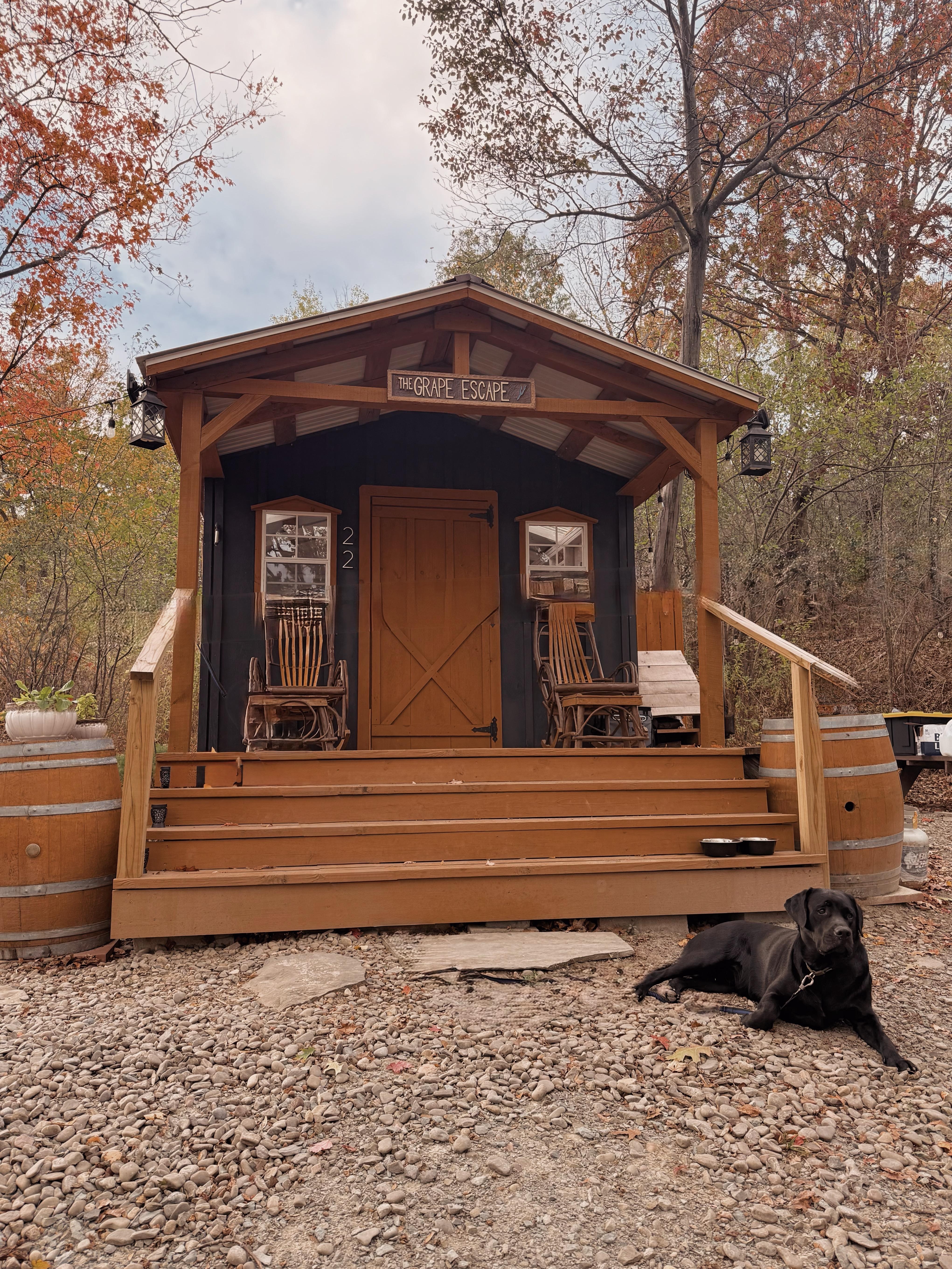THE GRAPE ESCAPE is a cozy & peaceful one room cabin overlooking Keuka Lake. Conveniently located 1/2 mile up the hill from Hammondsport. Located on Finger Lakes Wine Trail / Brew Trail. Private outhouse (composting toilet) and outdoor private shower. Clean and setup for couples. OFF THE GRID Glamping at it's finest! NO Electricity or running water, however we have unique options to accommodate a comfortable stay. Please Note: NO LINENS / PILLOWS / TOWELS are provided.