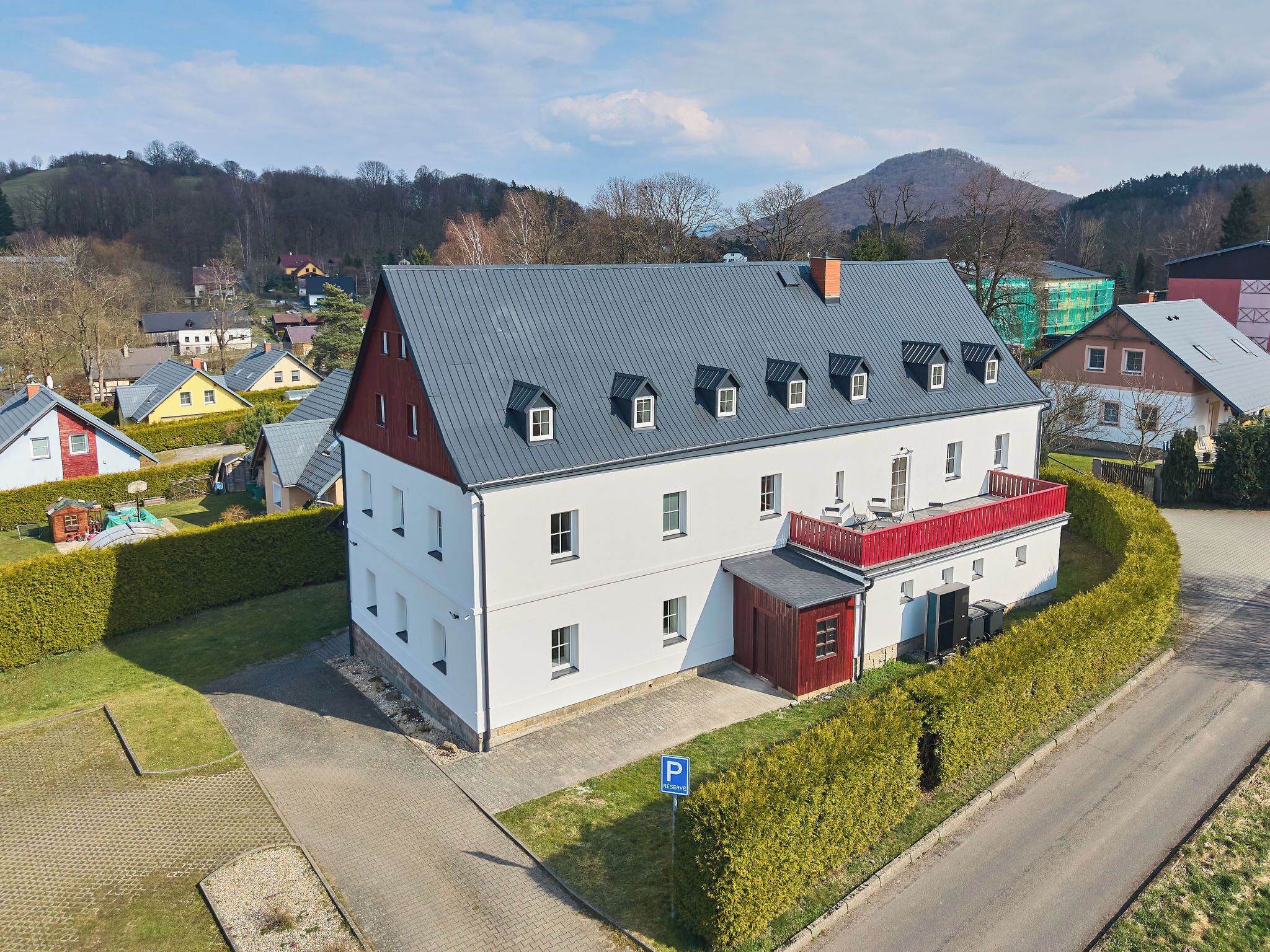 Vysoká Lípa, 15 km from Česká Kamenice: Modern, beautiful apartment block "Hofberg", 3 storeys, built in 2004. On the outskirts, in a secluded, quiet, sunny position on a slope, in the countryside. For shared use: property, swimming pool heated (9 x 5 m, seasonal availability: 25.Jun. - 30.Sep.). Tennis (extra), table tennis, volleyball, patio (40 m2), barbecue. In the house: lounge, storage room for bicycles, central heating system, burglar alarm system. Breakfast possible. Motor access to the house. Parking on the premises. Grocery 150 m, shopping centre 5 km, restaurant 150 m, bus stop "Jetřichovice, Vysoká Lípa" 200 m. Golf course (9 hole) 20 km, walking paths from the house, cycle lane 100 m, children's playground 200 m. Nearby attractions: přírodní památka Hofberg 800 m, vyhklídka Na zámečku 1 km, Kamenická vyhlídka 2 km, Malá Pravčická brána 3 m, Pravčická brána, Hřensko 10 km, Česká Kamenice, Děčín 23 km. Hiking paths: Via ferrata Kavárnička, stezka Růžová, CHKO Labské pískovce, Jetřichovické stěn, NP České Švýcarsko, Stezka Českem. Please note: the photograph shows a typical example. Additional accommodations can be booked. All houses/apartments are individually designed/furnished. 1-room studio 32 m2. Very beautiful and modern furnishings: living/sleeping room with 2 double beds and satellite TV. Kitchenette (2 ceramic glass hob hotplates, kettle, microwave, freezer) with dining table. Shower/WC. Electric heating. Box-room. Beautiful view of the countryside. Facilities: baby cot for up to 6 year olds. Internet (WiFi, free). Suitable for families. Maximum 2 pets/ dogs allowed.