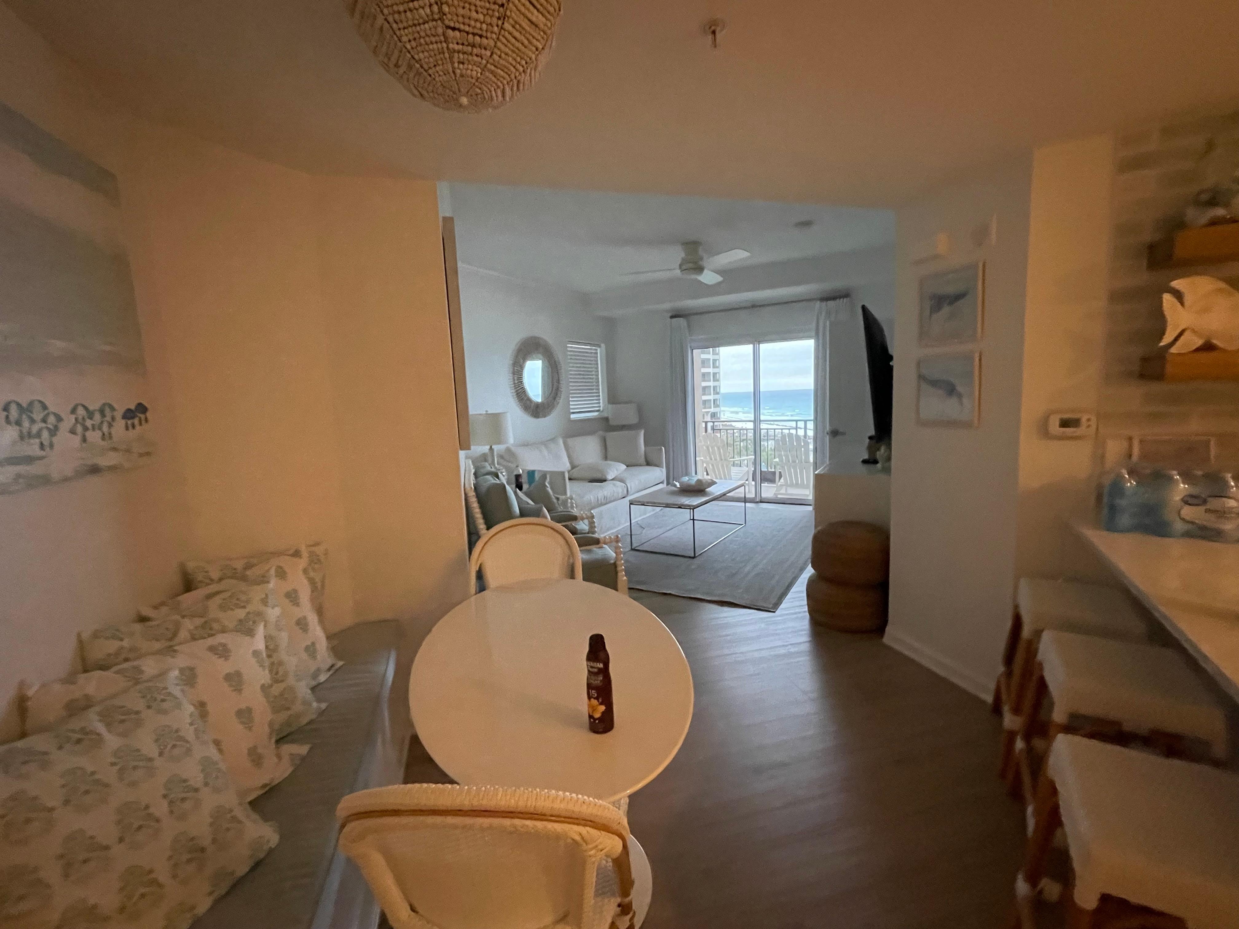 Step inside to discover a fully redesigned interior with a soothing beach-inspired palette, designer décor, and plush furnishings that create a serene, welcoming atmosphere. The open concept living area features brand-new furnishings, a smart TV, and stunning sliding glass doors leading to a spacious balcony. Here, you’ll enjoy breathtaking views of the Gulf, feel the warm Florida breeze, and watch the waves gently roll in — the ultimate spot to unwind and embrace the coastal lifestyle.