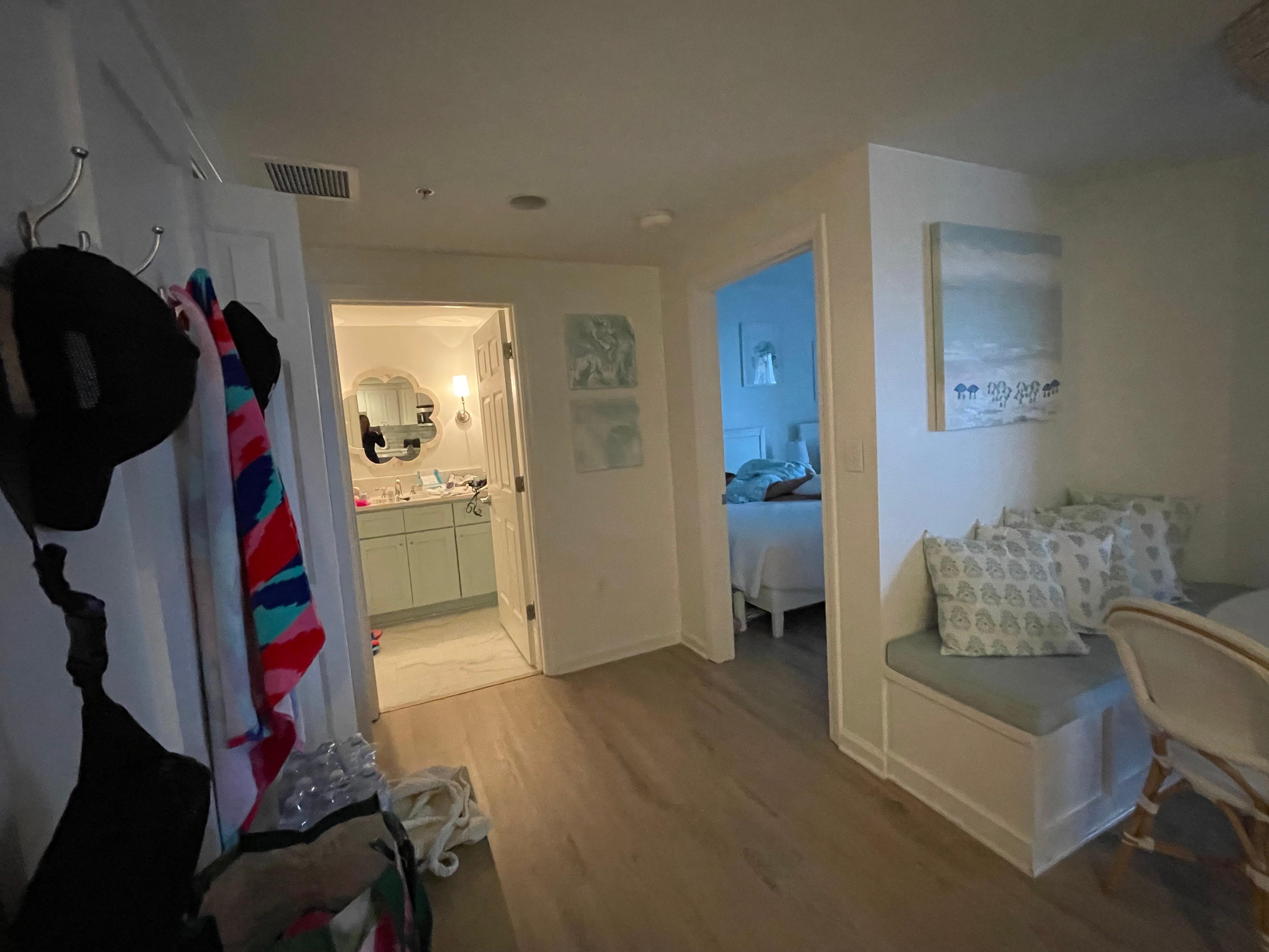 The spacious primary bedroom offers a peaceful retreat with breathtaking Gulf views, a luxurious king-size bed, smart TV, ample closet space, and direct access to the balcony. The en-suite bathroom has been completely renovated, featuring double vanities and a walk-in shower. The guest bedroom is furnished with two cozy queen beds and offers convenience to a beautifully updated hallway bathroom with a spacious walk-in shower.