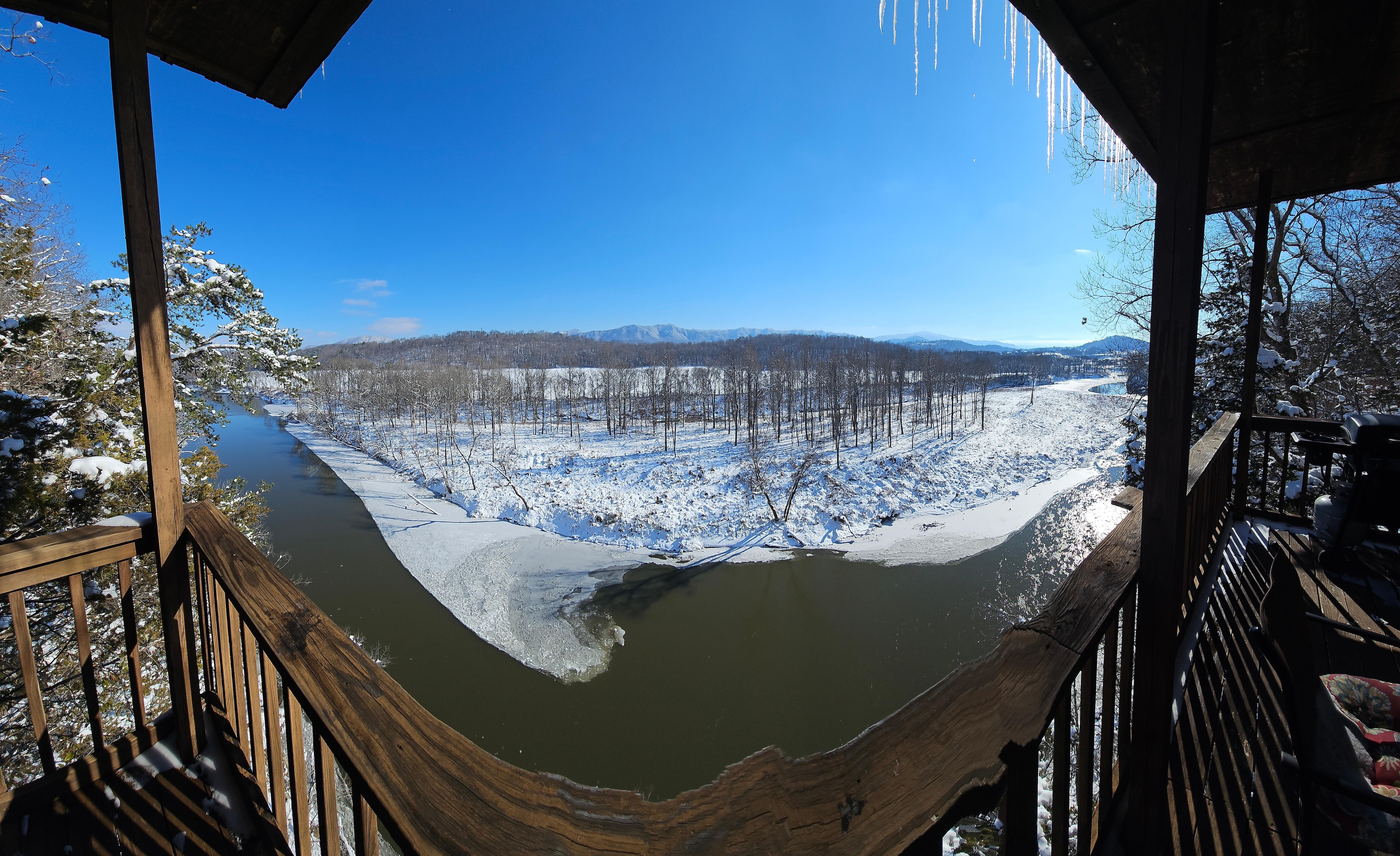 From every living space including the kitchen, living room, and bedrooms, you are surrounded by the beauty of the Smoky Mountains. You will want to stay home sip your coffee and drink in the view while you relax to the sound of the French Broad River slipping by far below.