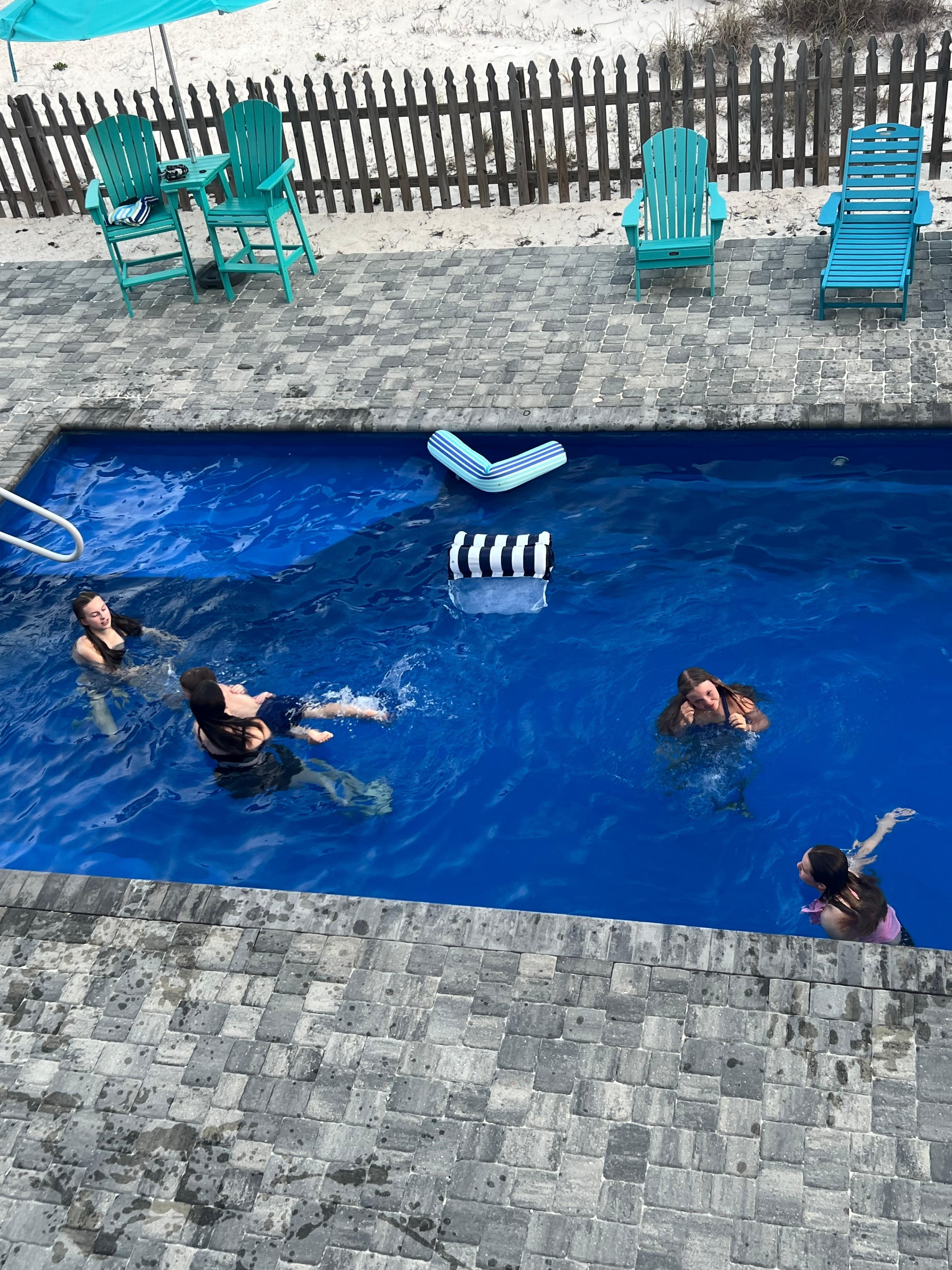 Peachy Queen is chock full of great amenities. The large backyard has a private pool surrounded by beautiful brick pavers. The patio is furnished with plenty of chairs for relaxing in the sun. The pool can be heated during cooler weather*. You will enjoy outdoor dining with a propane grill and two picnic tables poolside. An outdoor heated shower can be used for a quick sand rinse before entering the pool or house. Beach towels are available in case yours were forgotten.