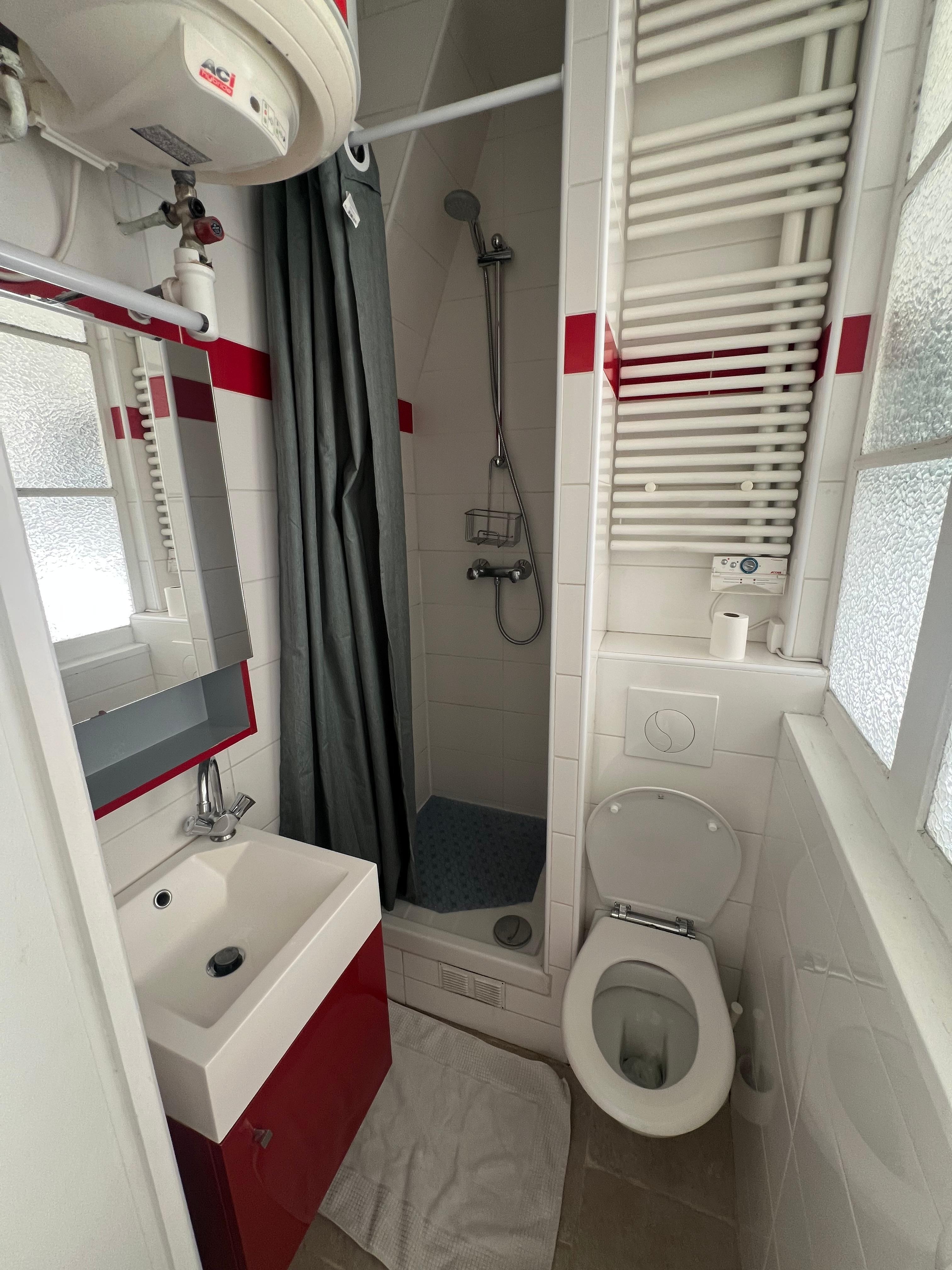The apartment which is on the first level ( second american ) of a XIX century building consists of a fully equipped kitchen with washer/dryer and a table for 2, a bedroom with a hotel quality queen size ( 160cm*200cm or 65*80 inches ) bed, closet, tv and desk and a small bathroom with shower, sink and toilet. kitchen and bedroom opens with 2 windows on a quiet and large courtyard planted with trees therefore is away from street noise. you can sleep with windows open. both windows close with wooden shutters.