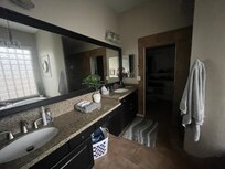 The primary suite is a private retreat, featuring a king-size Purple® mattress for your comfort, a walk-in shower, a separate soaking tub, dual vanities, and plenty of closet space for an extended stay