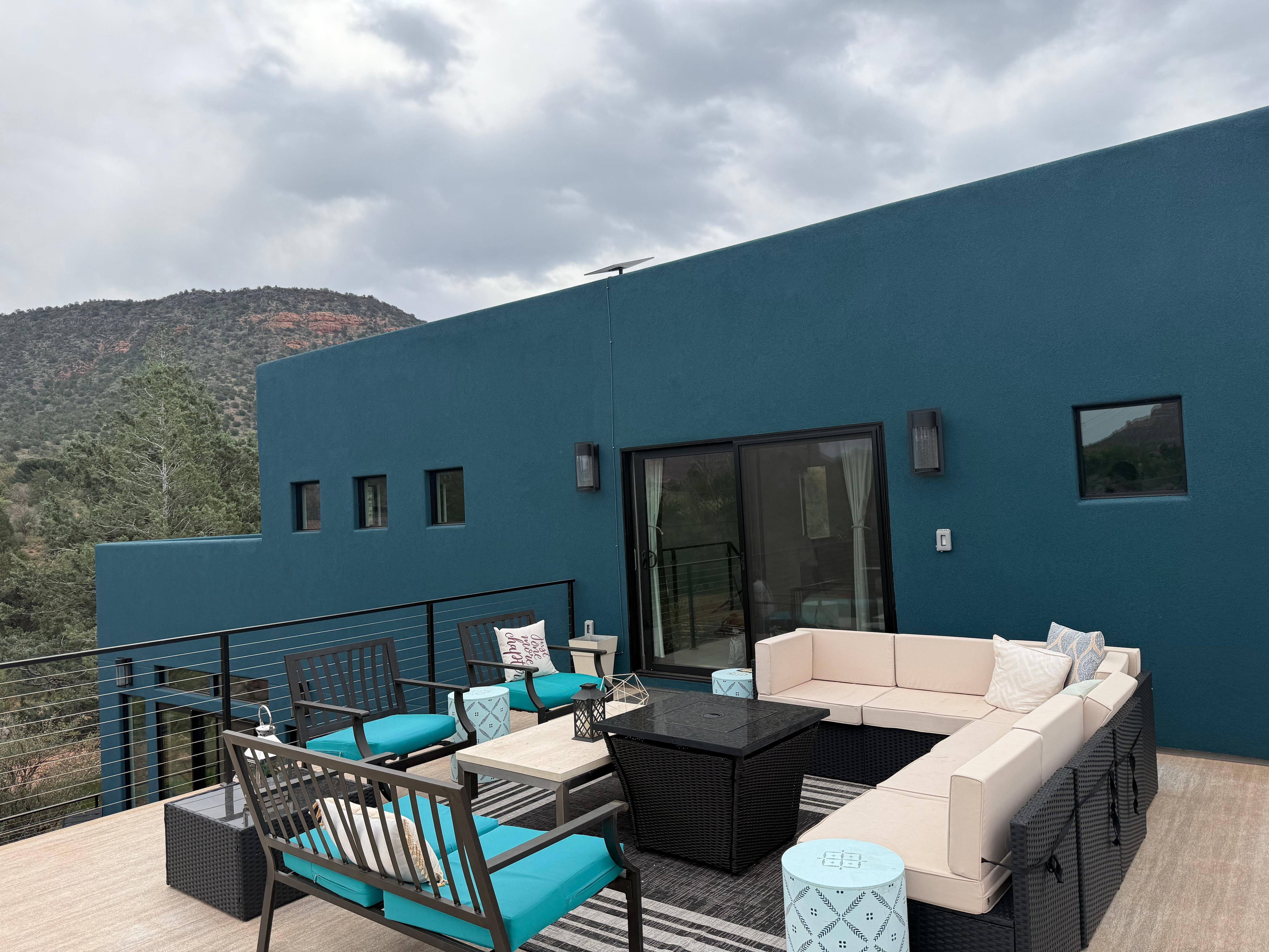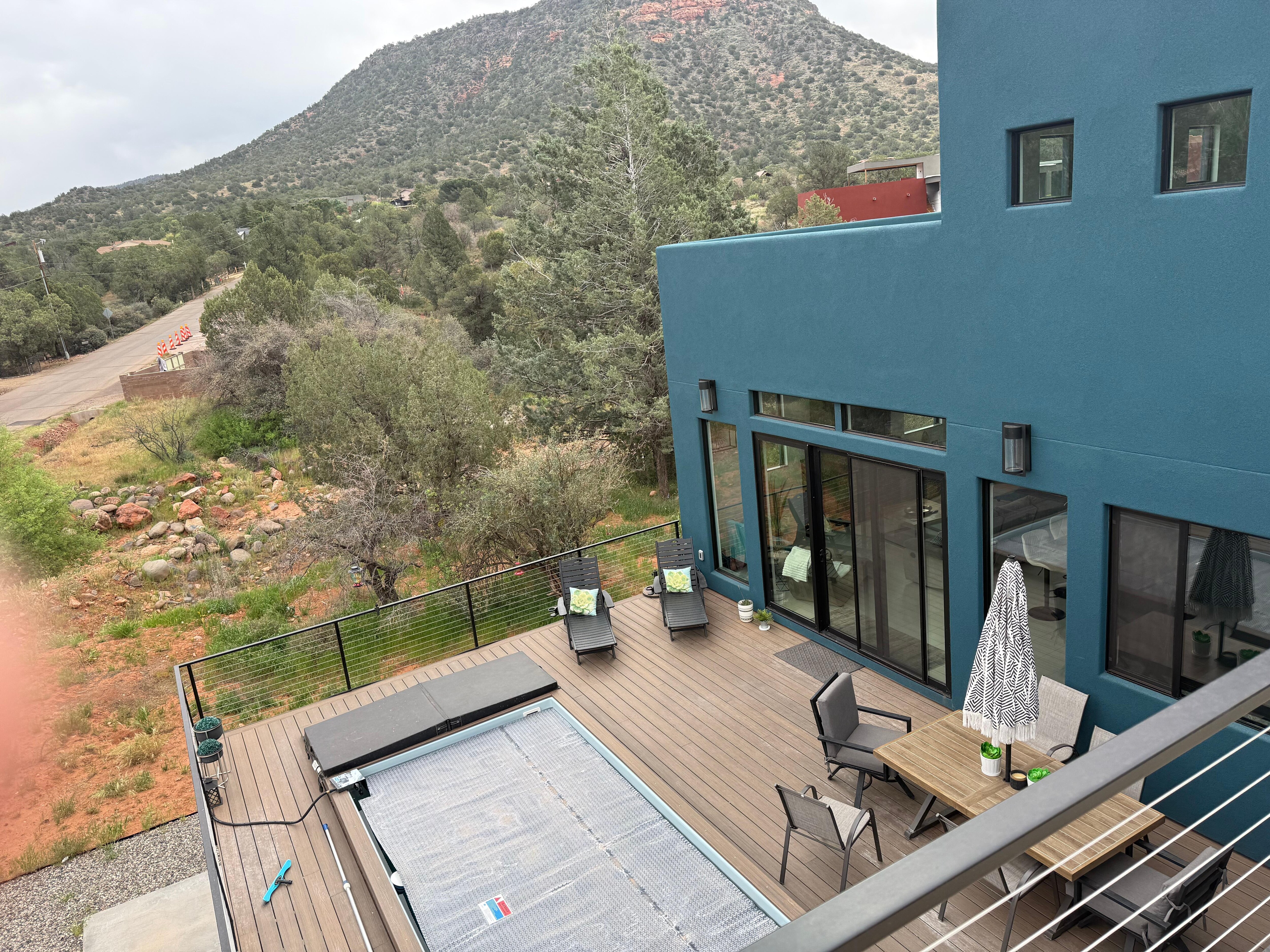 Located in Sedona in the Bell Rock Area, enjoy what this 3-bedroom amazing house has to offer. This luxe property features 2 king bed En Suites and 2 queen beds in open loft, perfect for a relaxing and fabulous stay. With amenities like heated or chilled pool, spa, Infrared sauna, steam shower, soaking tub, outdoor shower, StarlinkWiFi, a washing machine, and AC. Stocked with all necessities so guests can relax and unwind in this new modern home. The 4 bathrooms come equipped with a bathtub, shower, and bidet for added comfort. Rooftop deck with firepit and Red Rock Views make your sunsets unforgettable! Fun Outdoor Game Room with Smart TV in the shade with beverage fridge and plenty of seating. You're sure to make fantastic memories with a stay at our heavenly place.