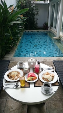 The rooms smelled like cigarettes and butts and other garbage were littered around the pool grass. Looks like they tried to fix things up with a fresh cost of paint, but instead did the cheapest bang up job ever...including spilling paint stains everywhere in the entire apartment. Dried paint splatter on the glass, on the floors, on the drapes, on the bed spread, paint spilled across the entire walkway from the reception to the room. Towels smelled like cigarettes. Water kettle looked more dirty then the toilet. Make shift Kitchen has a stove but no gas cylinder to turn it on. No pots or silverware or anything other then an ashtray in the kitchen. This place looks decent in photos but it’s a disappointment in person. The price point is way off for the reality. If they lowered the price to reflect what it really is, people would be less shocked and perhaps would expect to get less.