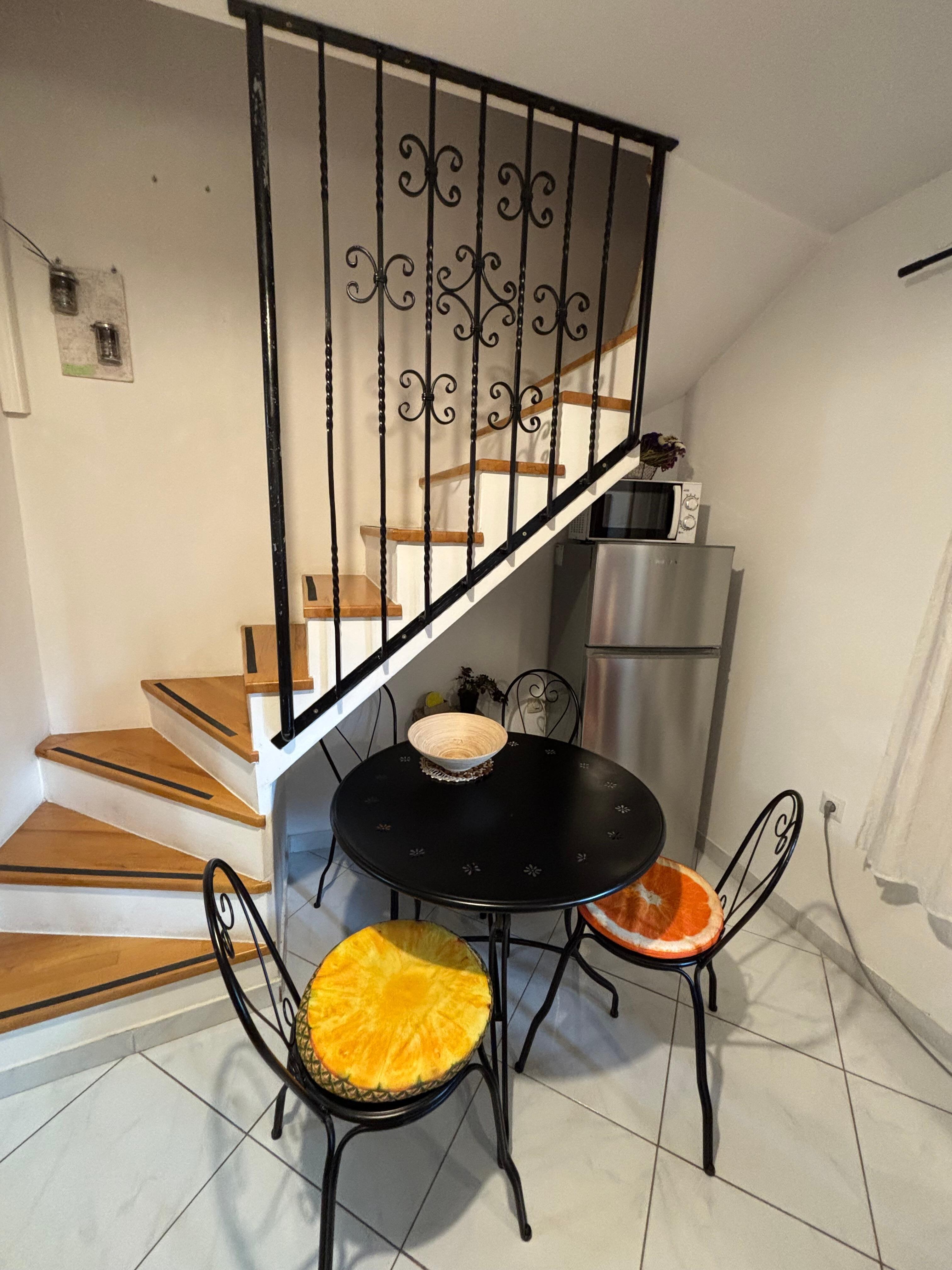 The main level includes a bright living area with a sofa bed suitable for two additional guests, a fully equipped kitchen with all essentials for cooking at home, a dining space, and a modern bathroom. With fast and reliable Wi-Fi, cable TV, two air-conditioning units, and a washing machine, the apartment provides everything you need for both short visits and longer stays.
