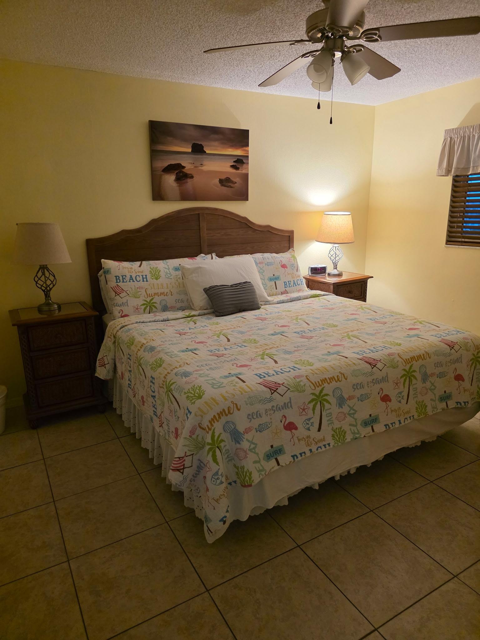 Bring the provided beach chairs and towels down to the shore each morning, and sleep soundly each evening in a primary bedroom with an adjacent full bathroom offering a granite vanity sink and a bathtub.