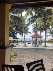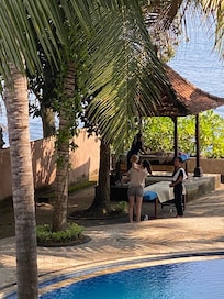 This property features an outdoor pool, as well as a private pool and a living room.
