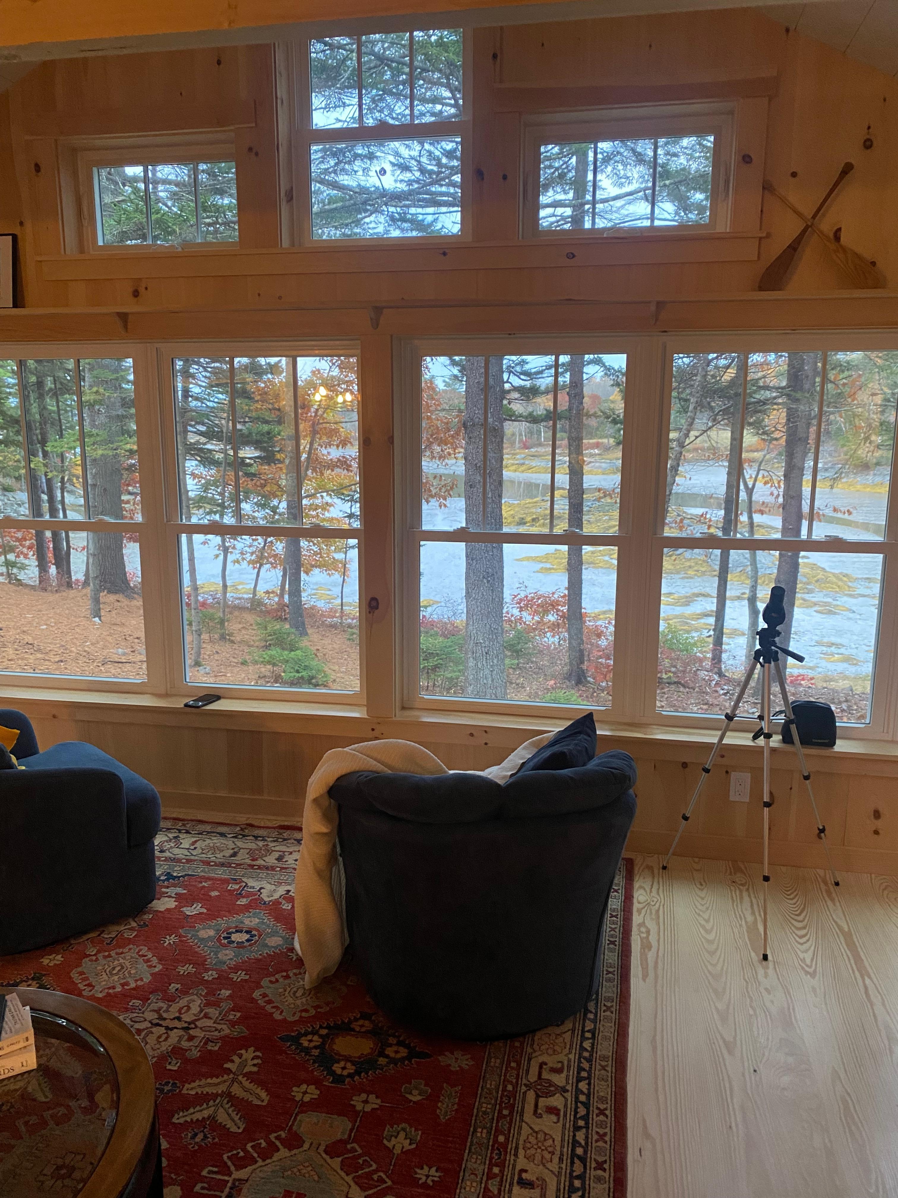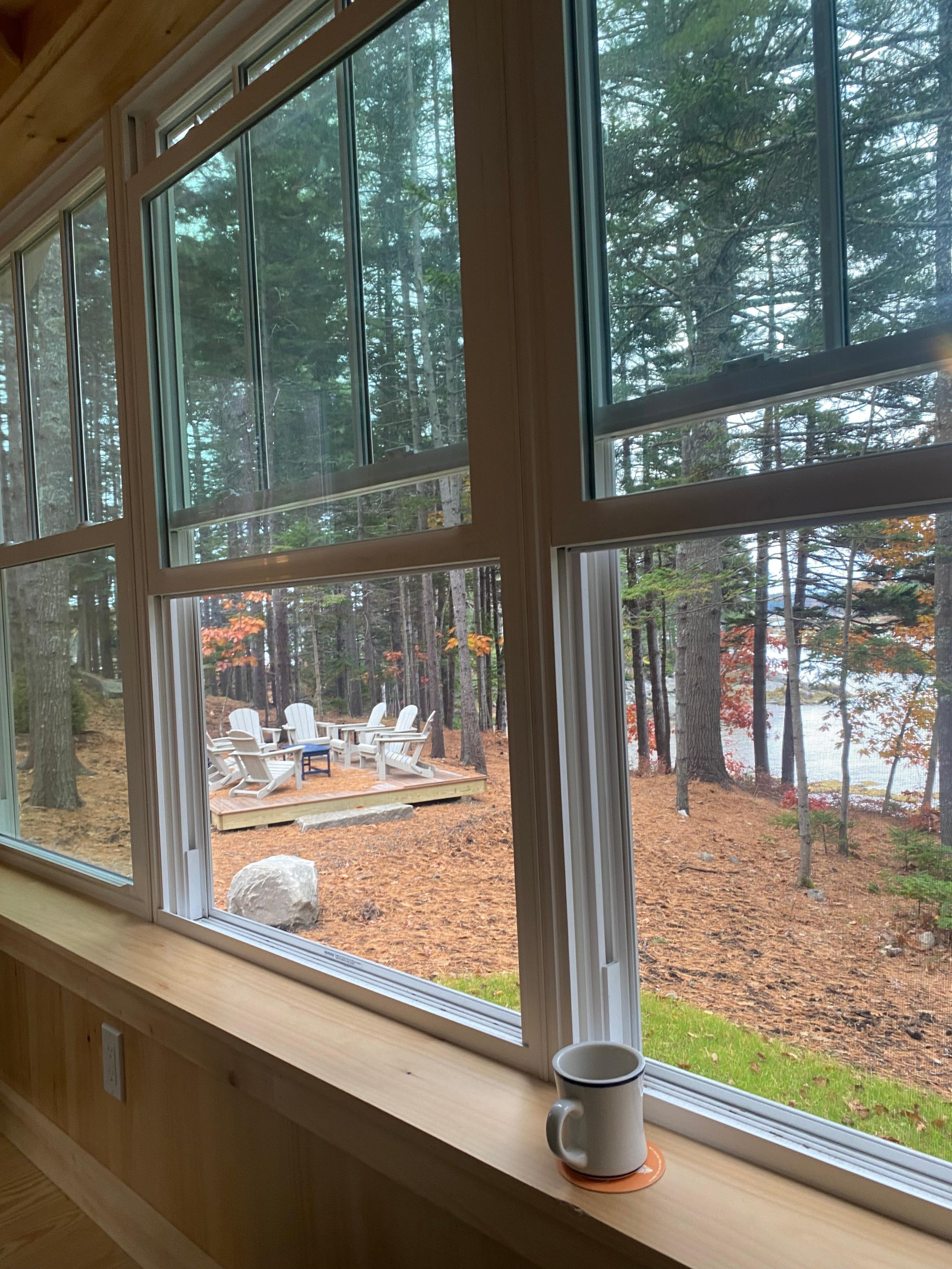 My husband and i fell in love with this gorgeous cabin in the woods with ocean/tides view . This place was brand new and wow it was like joanna Gaines from magnolia channel decorated it and designed the features and layout, straight out of a magazine dream So stunning blonde wood floors and pale pine ( i think walls .high ceilings every room was so charming and beautiful and clean wow now for the views floor to ceiling windows and skylights looking at the pine trees and ocean cove with the most spectacular sunrise so private and romantic and close about 20 min to the beautiful towns of Camden and Rockport close to so many great places but so amazing of a place that you got to spend that time there to soaking up pure beauty! Kitchen and bathroom perfect and a really cozy comfortable second floor tv room too . The lowere level is warmed by a wood burning stove that was perfect ! We had some beautiful fires in there but took great care and respect to be safe and keep things clean including opening the windows when first bldg the fire to not let the little bit of smoke that happens when you first start to build it with the door open . So everything stays fresh . The windows open easily and we enjoyed the fragrant fresh air while drinking our coffee in the mornings We didn’t want to leave and we will be back ! And we took the sieger cabin back to Cleveland with us in our hearts