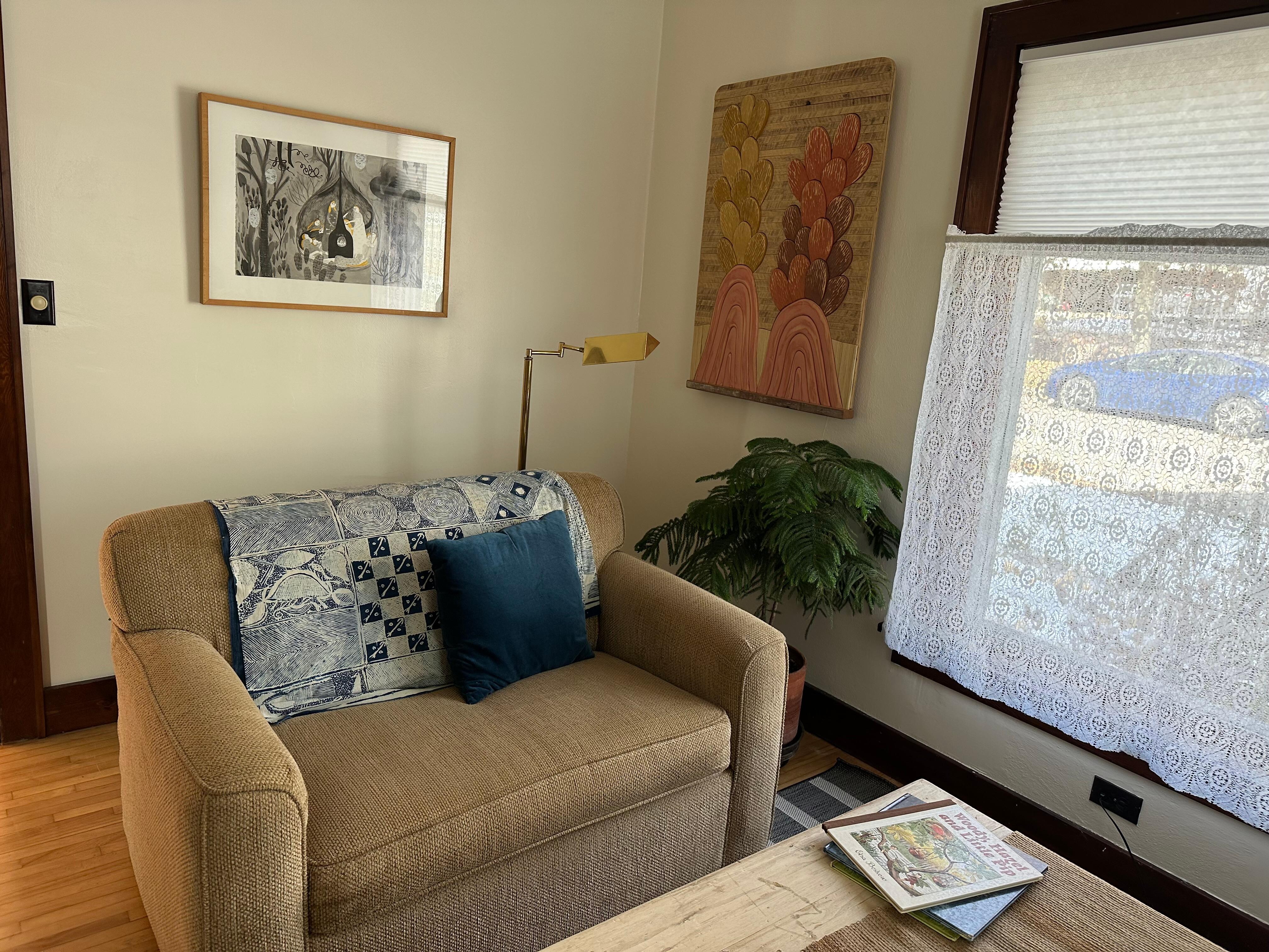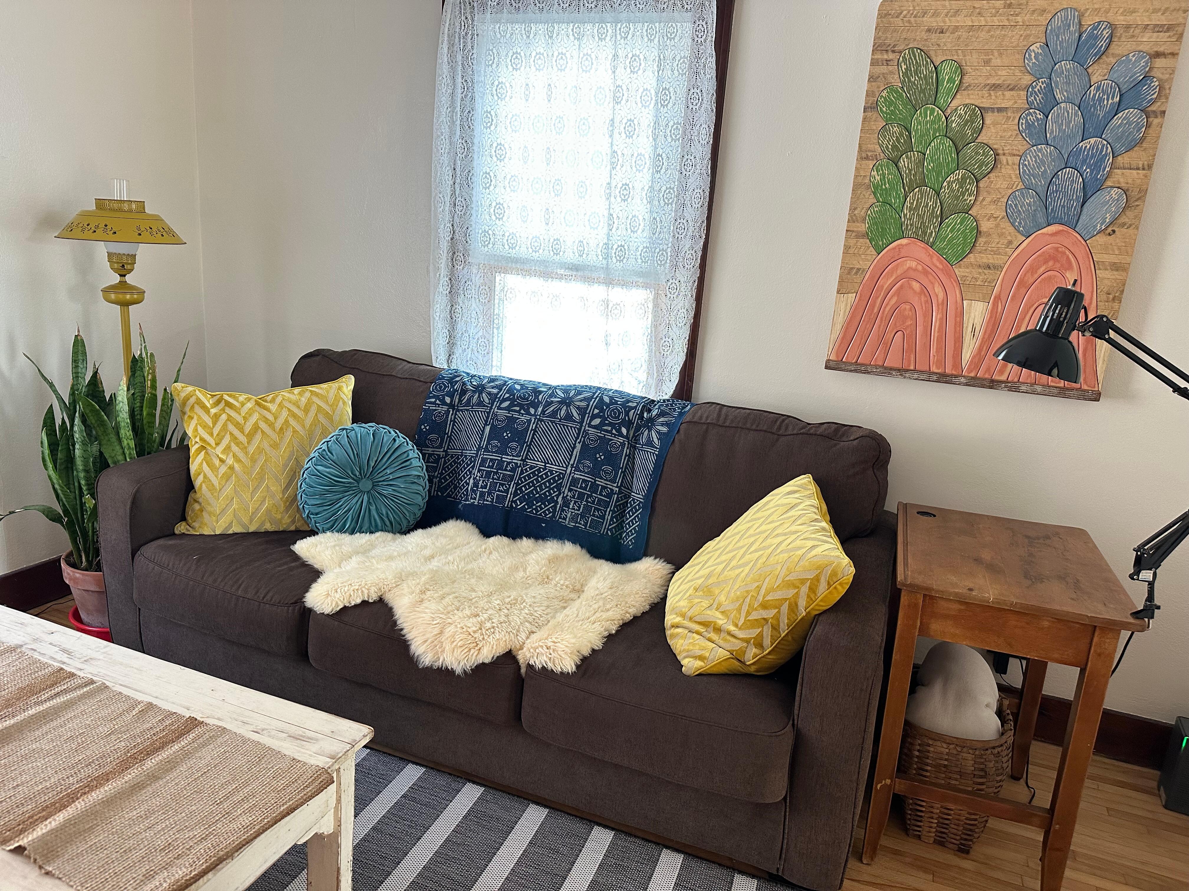 As your Viroqua home away from home our East South Street offers proximity to downtown, and also spacious privacy. Our 9 ft ceilings, wood floors, and windows make this home feel light and open. This house is recently lovingly redone and filled with our art and textile collection. Spend time out on the large back deck overlooking the flowers, yard, farm field and cemetery beyond. We know you will love our East South Street place as your home base.