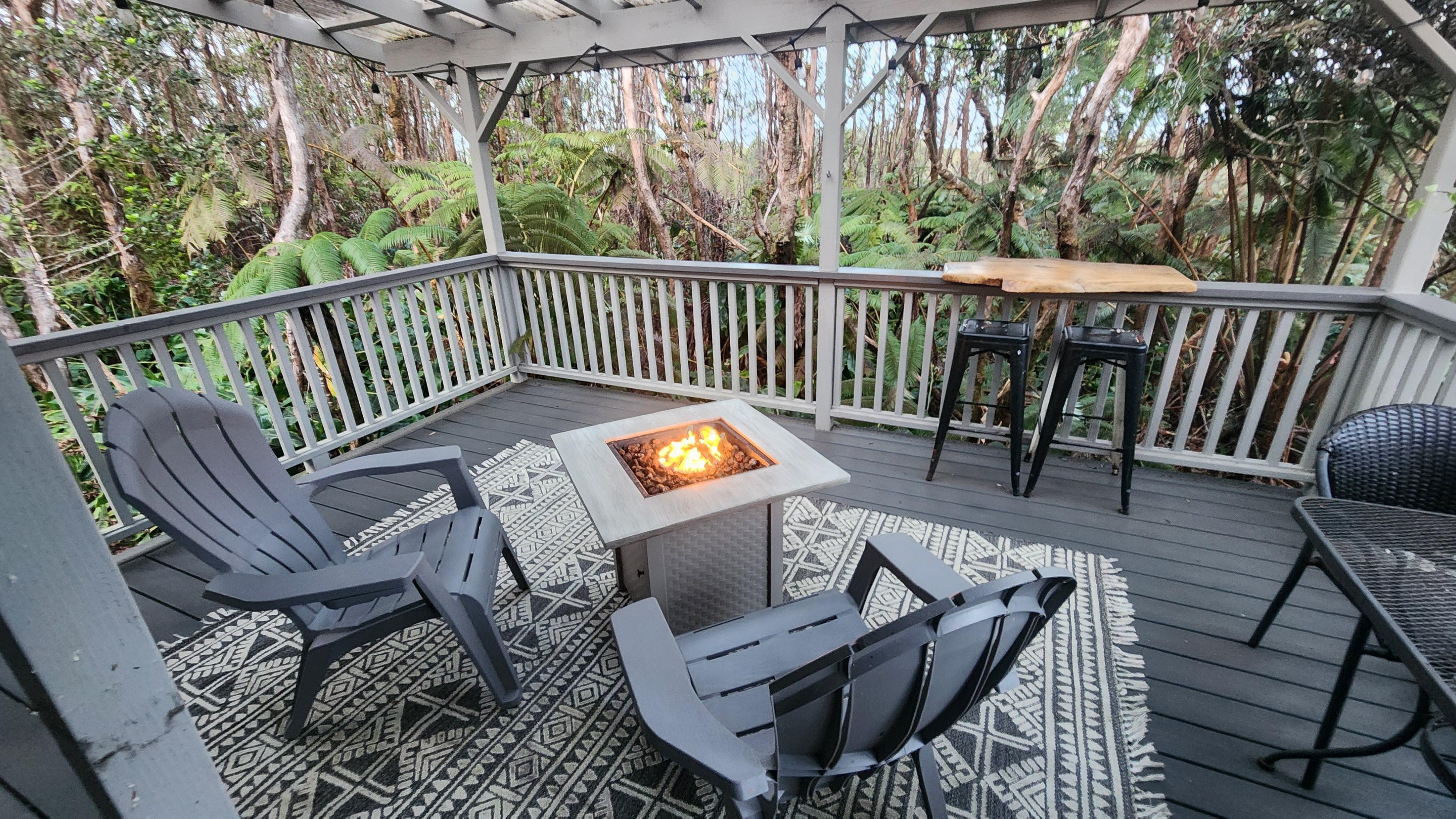 Outdoor living on the covered lanai has never been more enjoyable; with seating perfect for your morning coffee or evening glass of wine, and a propane fire pit to keep you warm and toasty at night.