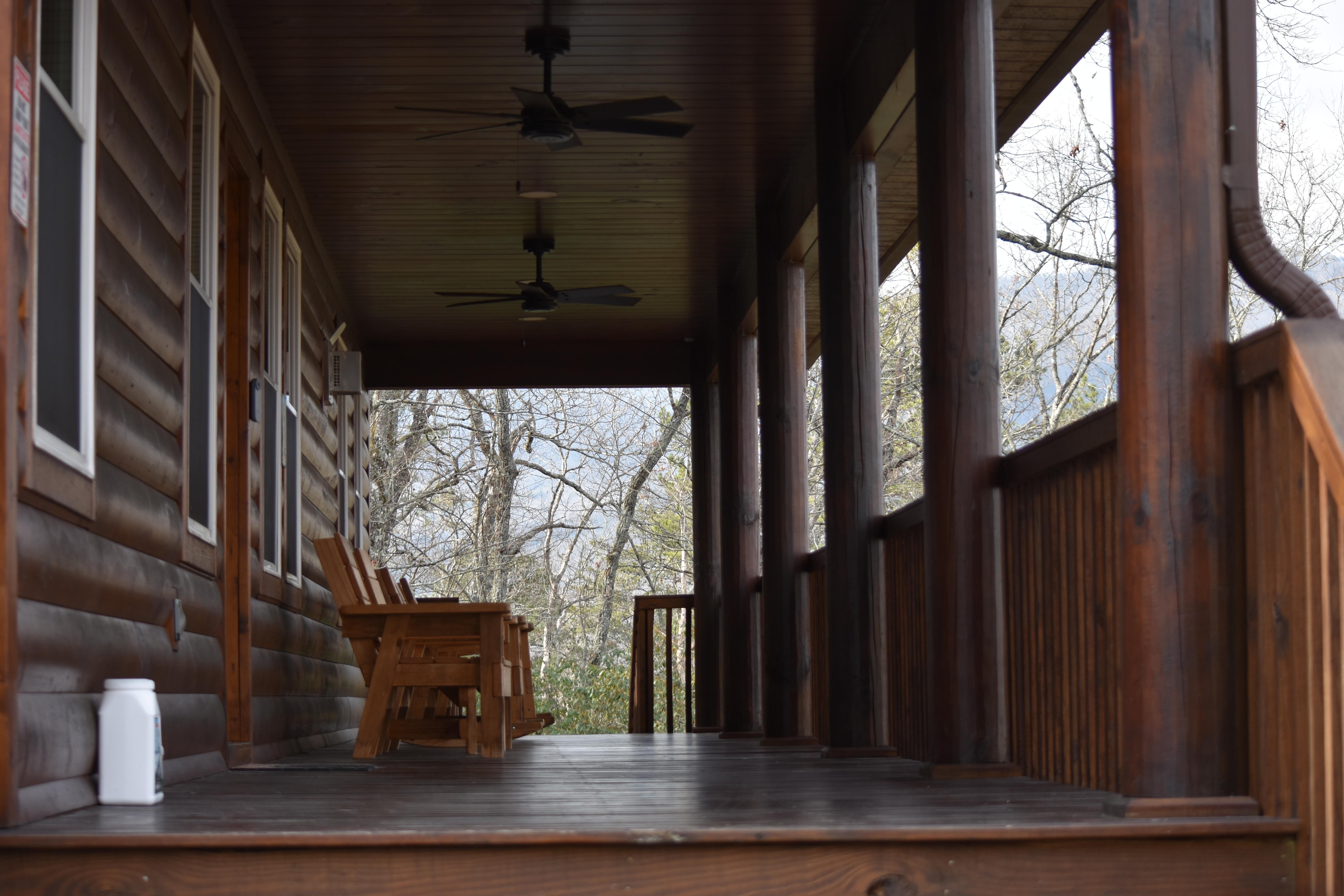 There are 3 parking spaces. This NEWLY BUILT Beautiful 1 level, 3 bedroom, 2 bath cabin comes with a ramp for those who have mobility issues climbing stairs. There is a platform walkway to the 5-6 person hot-tub from the covered porch. No more stepping on dirt or gravel if taking the steps from the covered porch to the walkway. The covered porch is 400 sq. feet ( 8 X 50).