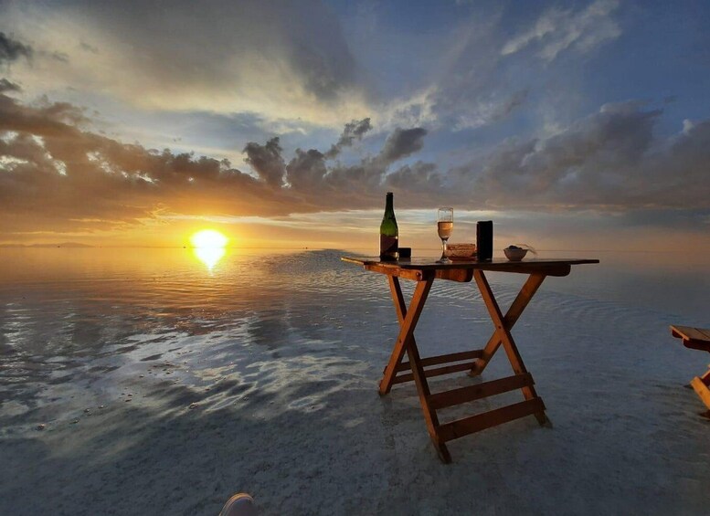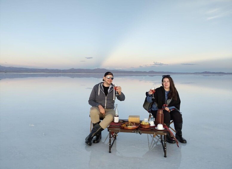 Enjoy a unique sunset in the salt flats accompanied by a special toast with local wines.