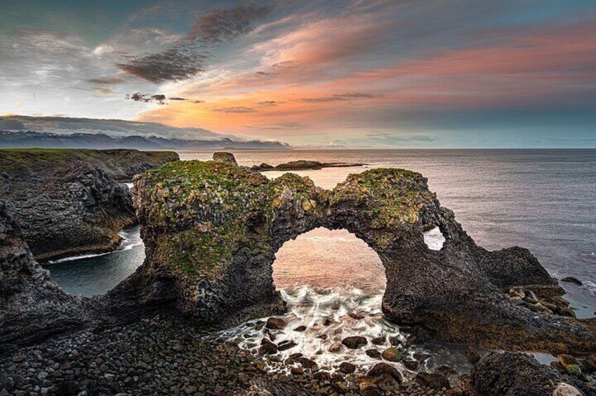Gatklettur, also known as Hellnar Arch, is a stunning natural stone arch located on the Snæfellsnes Peninsula in Iceland, formed by centuries of ocean erosion.
