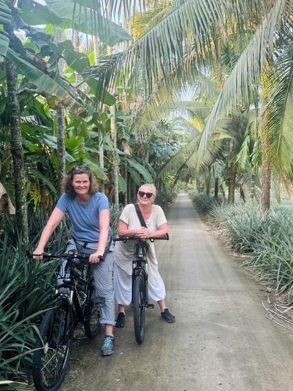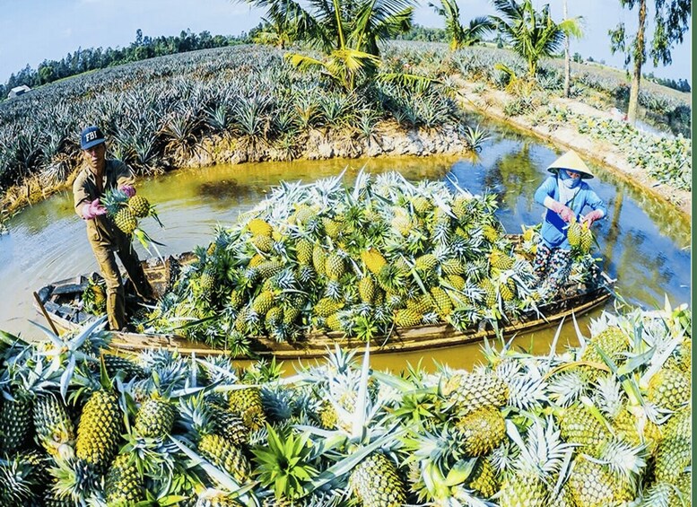 Bike slowly through the large 1,000-hectare village, where neat rows of pineapple plants cover the land and wide rice fields shine as they reflect the sky above. Coconut and areca palm trees line the paths, gently moving in the breeze and making the ride feel calm and relaxing. Along the way, you will see villagers doing everyday work, caring for their pineapple fields, fixing fishing nets by hand, and smiling as they go about their peaceful daily lives.